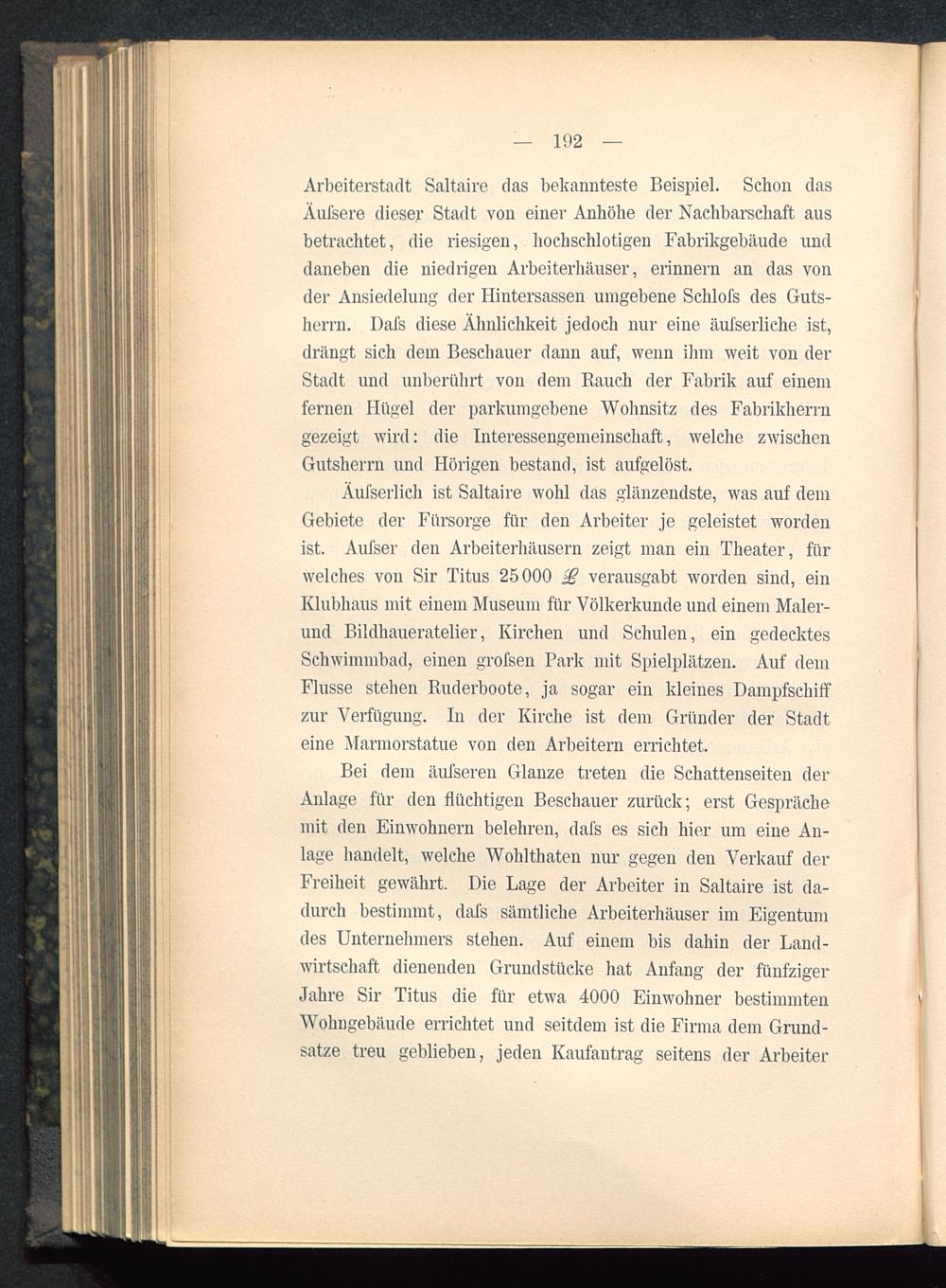 Äufserlich ist Saltaire wohl das glänzendste, was auf demGebiete der Fürsorge für den Arbeiter je geleistet wordenist. Aufser den Arbeiterhäusern zeigt man ein Theater, fürwelches von Sir Titus 25000 £ verausgabt worden sind, einKlubhaus mit einem Museum für Völkerkunde und einem Maler-und Bildhaueratelier, Kirchen und Schulen, ein gedecktesSchwimmbad, einen grofsen Park mit Spielplätzen. Auf demFlusse stehen Ruderboote, ja sogar ein kleines Dampfschiffzur Verfügung. In der Kirche ist dem Gründer der Stadteine Marmorstatue von den Arbeitern errichtet.