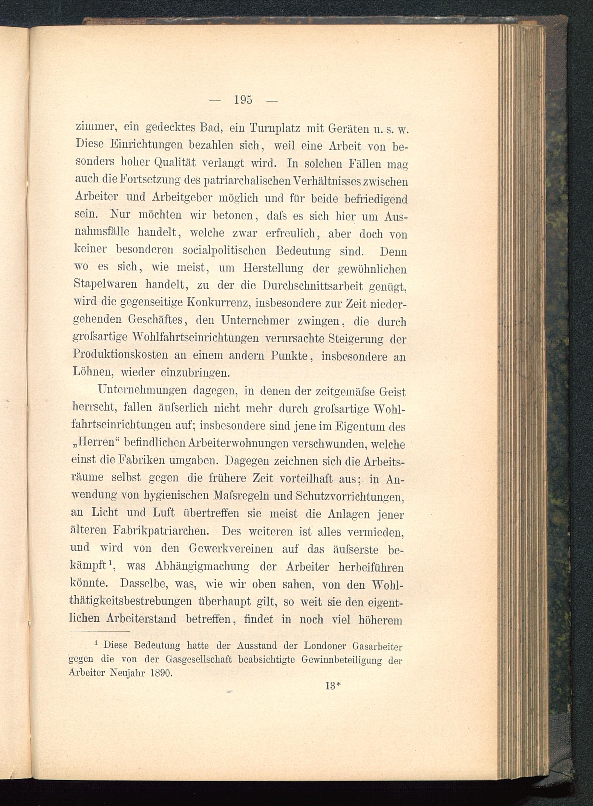 Unternehmungen dagegen, in denen der zeitgeinäfse Geistherrscht, fallen äufserlich nicht mehr durch grofsartige Wohl-fahrtseinrichtungen auf; insbesondere sind jene im Eigentum des„Herren" befindlichen Arbeiterwohnungen verschwunden, welcheeinst die Fabriken umgaben. Dagegen zeichnen sich die Arbeits-räume selbst gegen die frühere Zeit vorteilhaft aus; in An-wendung von hygienischen Mafsregeln und Schutzvorrichtungen,an Licht und Luft übertreffen sie meist die Anlagen jenerälteren Fabrikpatriarchen. Des weiteren ist alles vermieden,und wird von den Gewerkvereinen auf das äufserste be-kämpft 1 , was Abhängigmachung der Arbeiter herbeiführenkönnte. Dasselbe, was, wie wir oben sahen, von den Wohl-thätigkeitsbestrebungen überhaupt gilt, so weit sie den eigent-lichen Arbeiterstand betreffen, findet in noch viel höherem