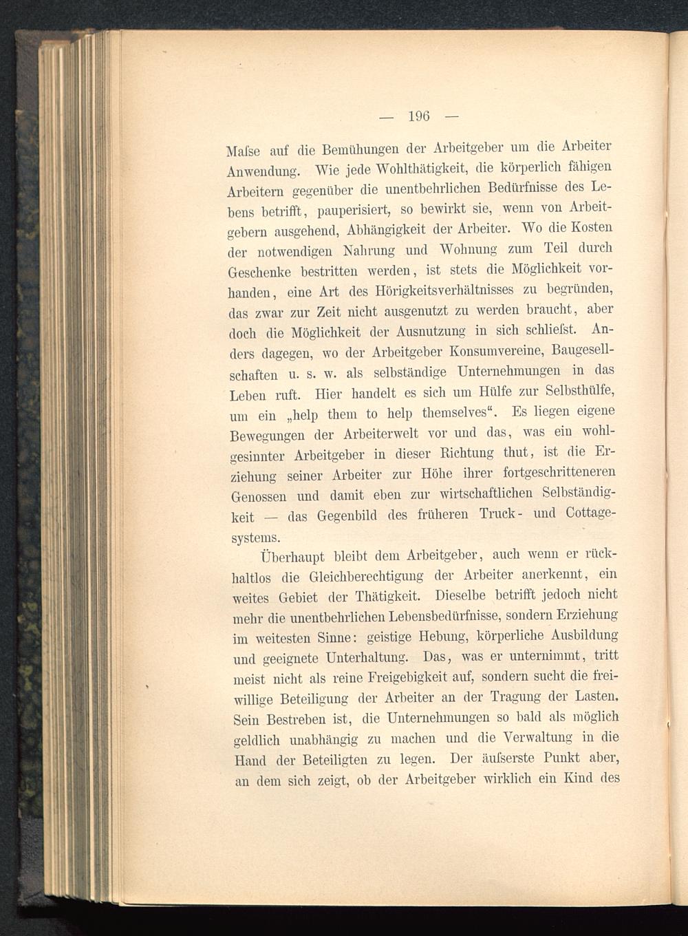 Überhaupt bleibt dem Arbeitgeber, auch wenn er rück-haltlos die Gleichberechtigung der Arbeiter anerkennt, einweites Gebiet der Thätigkeit. Dieselbe betrifft jedoch nichtmehr die unentbehrlichen Lebensbedürfnisse, sondern Erziehungim weitesten Sinne: geistige Hebung, körperliche Ausbildungund geeignete Unterhaltung. Das, was er unternimmt, trittmeist nicht als reine Freigebigkeit auf, sondern sucht die frei-willige Beteiligung der Arbeiter an der Tragung der Lasten.Sein Bestreben ist, die Unternehmungen so bald als möglichgeldlich unabhängig zu machen und die Verwaltung in dieHand der Beteiligten zu legen. Der äufserste Punkt aber,an dem sich zeigt, ob der Arbeitgeber wirklich ein Kind des