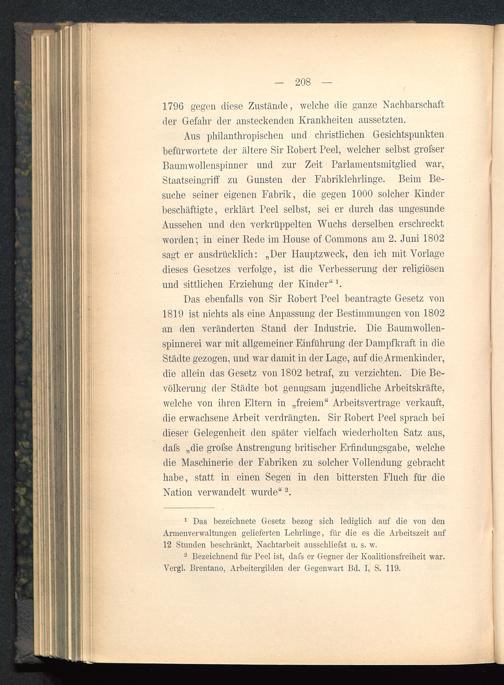Aus philanthropischen und christlichen Gesichtspunktenbefürwortete der ältere Sir Robert Peel , welcher selbst grofserBaumwollenspinner und zur Zeit Parlamentsmitglied war,Staatseingriff zu Gunsten der Fabriklehrlinge. Beim Be-suche seiner eigenen Fabrik, die gegen 1000 solcher Kinderbeschäftigte, erklärt Peel selbst, sei er durch das ungesundeAussehen und den verkrüppelten Wuchs derselben erschrecktworden; in einer Rede im House of Commons am 2. Juni 1802sagt er ausdrücklich: „Der Hauptzweck, den ich mit Vorlagedieses Gesetzes verfolge, ist die Verbesserung der religiösenund sittlichen Erziehung der Kinder" P