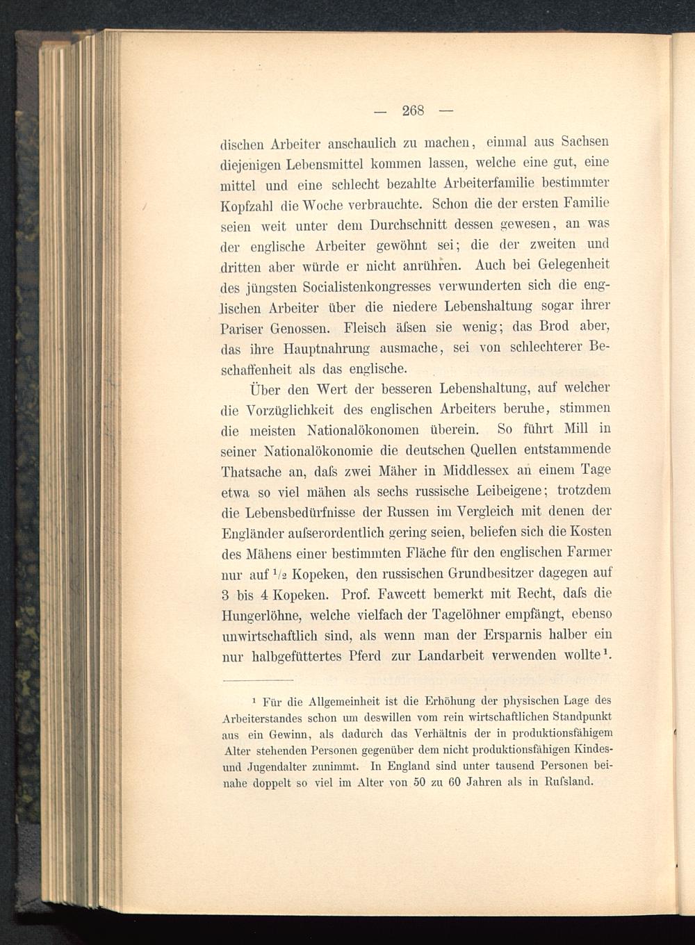 Über den Wert der besseren Lebenshaltung, auf welcherdie Vorzüglichkeit des englischen Arbeiters beruhe, stimmendie meisten Nationalökonomen überein. So führt Mill inseiner Nationalökonomie die deutschen Quellen entstammendeThatsache an, dafs zwei Mäher in Middlessex an einem Tageetwa so viel mähen als sechs russische Leibeigene; trotzdemdie Lebensbedürfnisse der Bussen im Vergleich mit denen derEngländer aufserordentlich gering seien, beliefen sieh die Kostendes Mähens einer bestimmten Fläche für den englischen Farmernur auf 1 /s Kopeken, den russischen Grundbesitzer dagegen auf3 bis 4 Kopeken. Prof. Fawcett bemerkt mit Kecht, dafs dieIlungerlöhne, welche vielfach der Tagelöhner empfängt, ebensounwirtschaftlich sind, als wenn man der Ersparnis halber einnur halbgefüttertes Pferd zur Landarbeit verwenden wollte 1 .