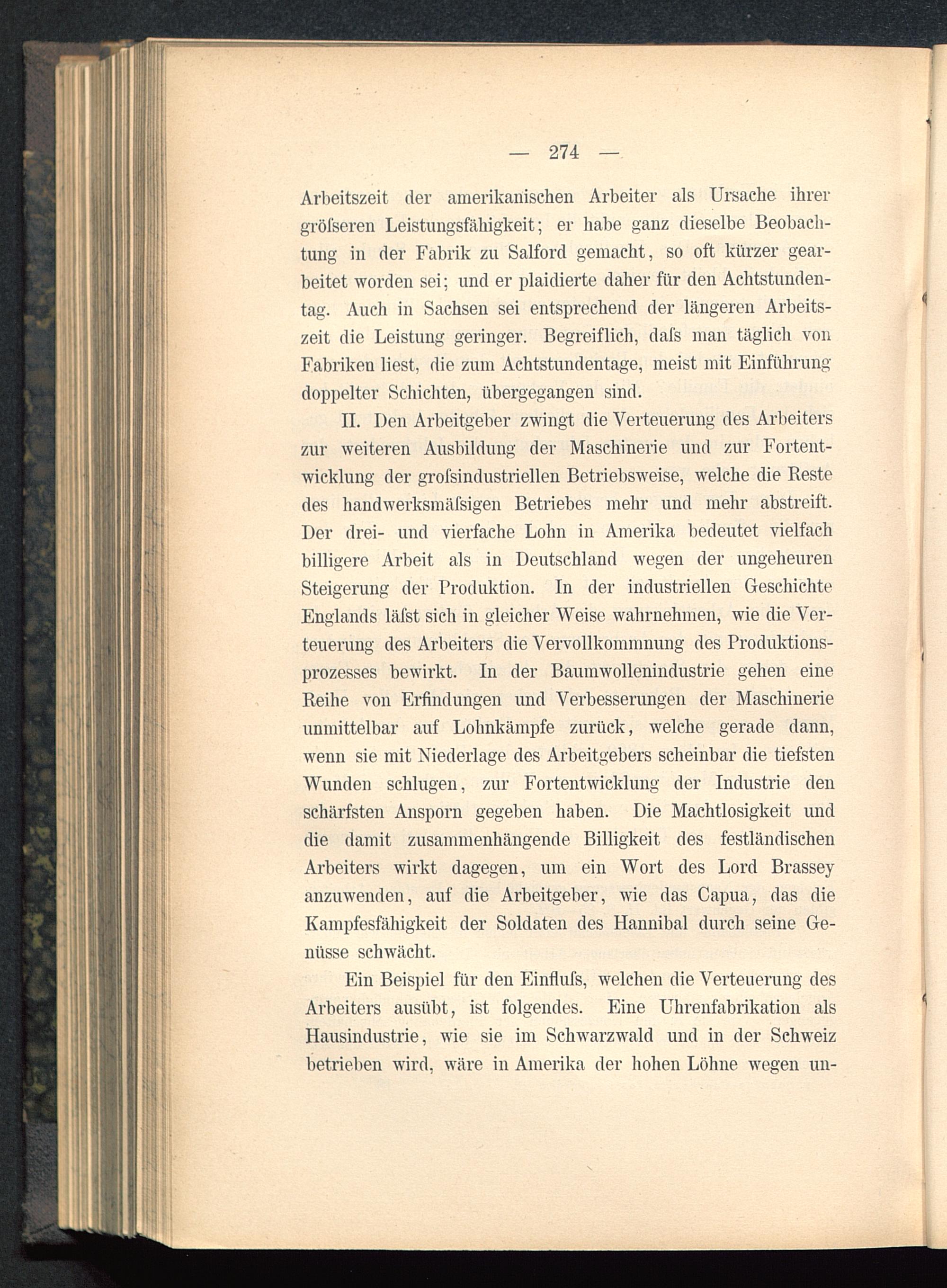 II. Den Arbeitgeber zwingt die Verteuerung des Arbeiterszur weiteren Ausbildung der Maschinerie und zur Fortent-wicklung der grofsindustriellen Betriebsweise, welche die Bestedes handwerksmäfsigen Betriebes mehr und mehr abstreift.Der drei- und vierfache Lohn in Amerika bedeutet vielfachbilligere Arbeit als in Deutschland wegen der ungeheurenSteigerung der Produktion. In der industriellen GeschichteEnglands läfst sich in gleicher Weise wahrnehmen, wie die Ver-teuerung des Arbeitei'S die Vervollkommnung des Produktions-prozesses bewirkt. In der Bauinwollenindustrie gehen eineReihe von Erfindungen und Verbesserungen der Maschinerieunmittelbar auf Lohnkämpfe zurück, welche gerade dann,wenn sie mit Niederlage des Arbeitgebers scheinbar die tiefstenWunden schlugen, zur Fortentwicklung der Industrie denschärfsten Ansporn gegeben haben. Die Machtlosigkeit unddie damit zusammenhängende Billigkeit des festländischenArbeiters wirkt dagegen, um ein Wort des Lord Brassey anzuwenden, auf die Arbeitgeber, wie das Capua, das dieKampfesfähigkeit der Soldaten des Hannibal durch seine Ge-nüsse schwächt.