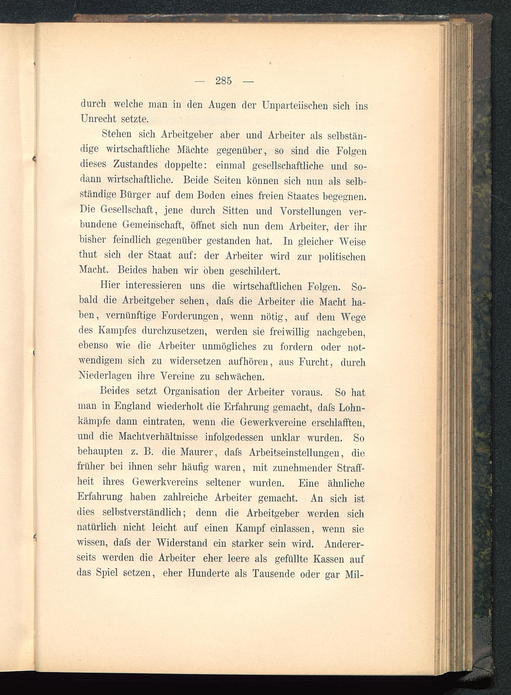 Beides setzt Organisation der Arbeiter voraus. So hatman in England wiederholt die Erfahrung gemacht, dafs Lohn-kämpfe dann eintraten, wenn die Gewerkvereine erschlafften,und die Machtverhältnisse infolgedessen unklar wurden. Sobehaupten z. B. die Maurer, dafs Arbeitseinstellungen, diefrüher bei ihnen sehr häufig waren, mit zunehmender Straff-heit ihres Gewerkvereins seltener wurden. Eine ähnlicheErfahrung haben zahlreiche Arbeiter gemacht. An sich istdies selbstverständlich; denn die Arbeitgeber werden sichnatürlich nicht leicht auf einen Kampf einlassen, wenn siewissen, dafs der Widerstand ein starker sein wird. Anderer-seits werden die Arbeiter eher leere als gefüllte Kassen aufdas Spiel setzen, eher Hunderte als Tausende oder gar Mil-
