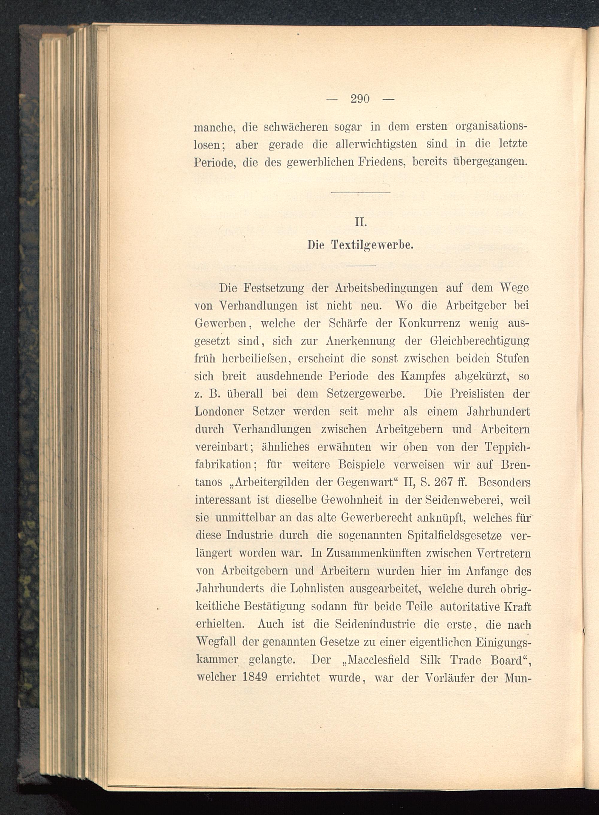 Die Festsetzung der Arbeitsbedingungen auf dem Wegevon Verhandlungen ist nicht neu. Wo die Arbeitgeber beiGewerben, welche der Schärfe der Konkurrenz wenig aus-gesetzt sind, sich zur Anerkennung der Gleichberechtigungfrüh herbeiliefsen, erscheint die sonst zwischen beiden Stufensich breit ausdehnende Periode des Kampfes abgekürzt, soz. B. überall bei dem Setzergewerbe. Die Preislisten derLondoner Setzer werden seit mehr als einem Jahrhundertdurch Verhandlungen zwischen Arbeitgebern und Arbeiternvereinbart; ähnliches erwähnten wir oben von der Teppich-fabrikation; für weitere Beispiele verweisen wir auf Bren-tanos „Arbeitergilden der Gegenwart" II, S. 267 ff. Besondersinteressant ist dieselbe Gewohnheit in der Seidenweberei, weilsie unmittelbar an das alte Gewerberecht anknüpft, welches fürdiese Industrie durch die sogenannten Spital fiel d sgesetze ver-längert worden war. In Zusammenkünften zwischen Vertreternvon Arbeitgebern und Arbeitern wurden hier im Anfange desJahrhunderts die Lohnlisten ausgearbeitet, welche durch obrig-keitliche Bestätigung sodann für beide Teile autoritative Krafterhielten. Auch ist die Seidenindustrie die erste, die nachWegfall der genannten Gesetze zu einer eigentlichen Einigungs-kammer gelangte. Der „Macclesfield Silk Trade Board",welcher 1849 errichtet wurde, war der Vorläufer der Mim-