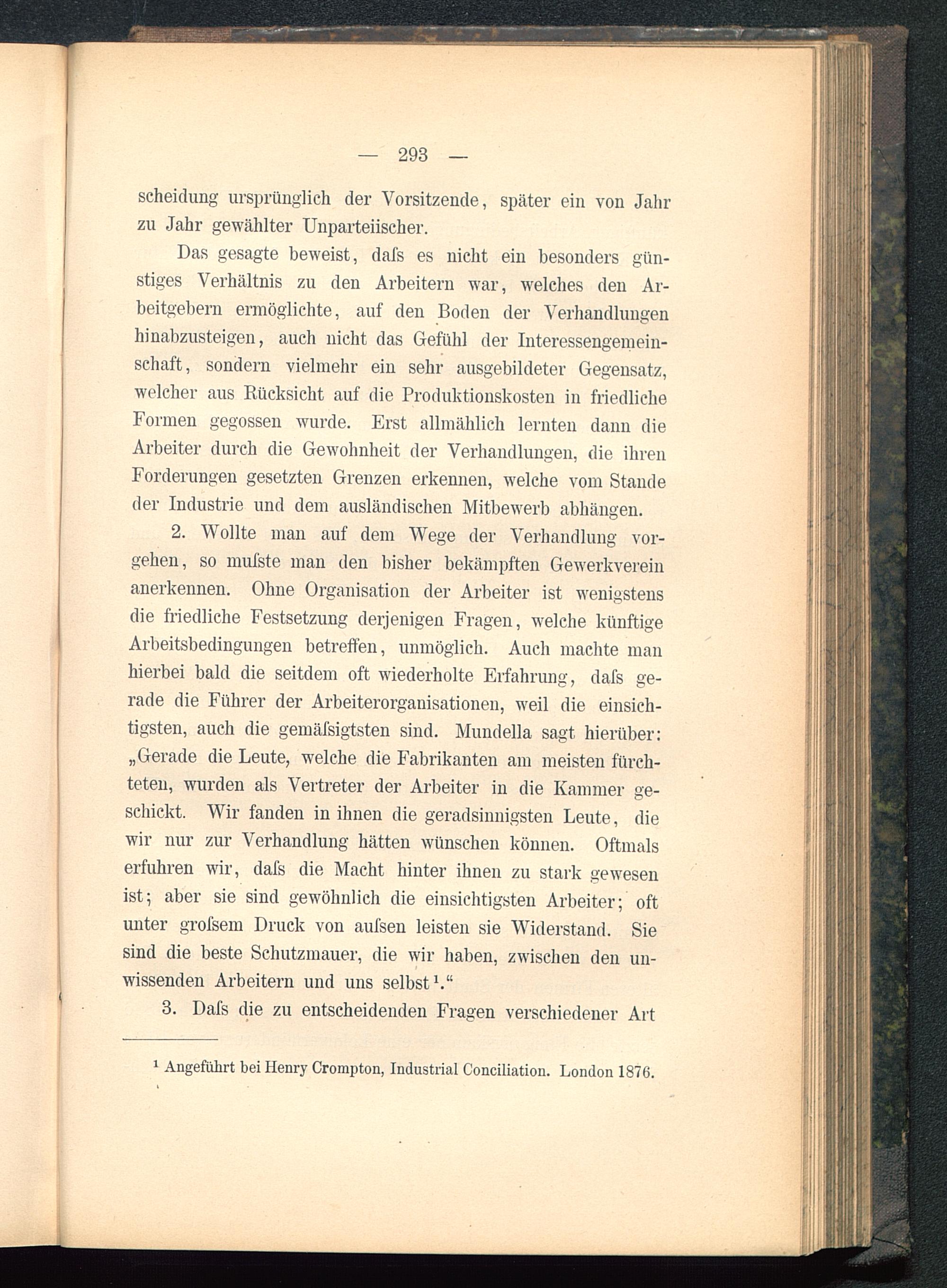 2. Wollte man auf dem Wege der Verhandlung vor-gehen, so mufste man den bisher bekämpften Gewerkvereinanerkennen. Ohne Organisation der Arbeiter ist wenigstensdie friedliche Festsetzung derjenigen Fragen, welche künftigeArbeitsbedingungen betreifen, unmöglich. Auch machte manhierbei bald die seitdem oft wiederholte Erfahrung, dafs ge-rade die Führer der Arbeiterorganisationen, weil die einsich-tigsten, auch die gemäfsigtsten sind. Mundella sagt hierüber:„Gerade die Leute, welche die Fabrikanten am meisten fürch-teten, wurden als Vertreter der Arbeiter in die Kammer ge-schickt. Wir fanden in ihnen die geradsinnigsten Leute, diewir nur zur Verhandlung hätten wünschen können. Oftmalserfuhren vir, dafs die Macht hinter ihnen zu stark gewesenist; aber sie sind gewöhnlich die einsichtigsten Arbeiter; oftunter grofsem Druck von aufsen leisten sie Widerstand. Siesind die beste Schutzmauer, die wir haben, zwischen den un-wissenden Arbeitern und uns selbst 1 ."