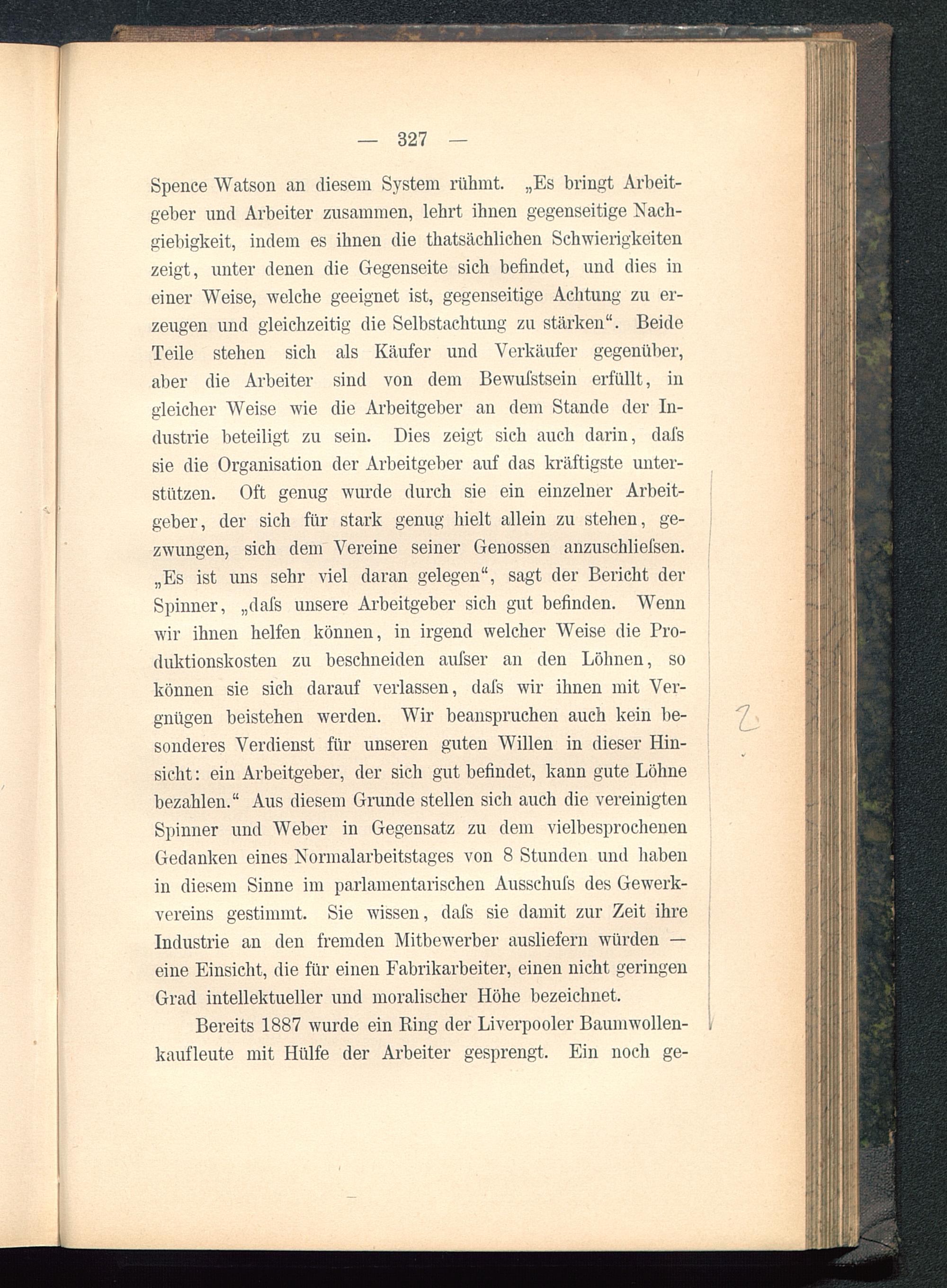 Spence Watson an diesem System rühmt. „Es bringt Arbeit-geber und Arbeiter zusammen, lehrt ihnen gegenseitige Nach-giebigkeit, indem es ihnen die thatsächlichen Schwierigkeitenzeigt, unter denen die Gegenseite sich befindet, und dies ineiner Weise, welche geeignet ist, gegenseitige Achtung zu er-zeugen und gleichzeitig die Selbstachtung zu stärken". BeideTeile stehen sich als Käufer und Verkäufer gegenüber,aber die Arbeiter sind von dem Bewufstsein erfüllt, ingleicher Weise wie die Arbeitgeber an dem Stande der In-dustrie beteiligt zu sein. Dies zeigt sich auch darin, dafssie die Organisation der Arbeitgeber auf das kräftigste unter-stützen. Oft genug wurde durch sie ein einzelner Arbeit-geber, der sich für stark genug hielt allein zu stehen, ge-zwungen, sich dem Vereine seiner Genossen anzuschliefsen.„Es ist uns sehr viel daran gelegen", sagt der Bericht derSpinner, „dafs unsere Arbeitgeber sich gut befinden. Wennwir ihnen helfen können, in irgend welcher Weise die Pro-duktionskosten zu beschneiden aufser an den Löhnen, sokönnen sie sich darauf verlassen, dafs wir ihnen mit Ver-gnügen beistehen werden. Wir beanspruchen auch kein be-sonderes Verdienst für unseren guten Willen in dieser Hin-sicht : ein Arbeitgeber, der sich gut befindet, kann gute Löhnebezahlen." Aus diesem Grunde stellen sich auch die vereinigtenSpinner und Weber in Gegensatz zu dem vielbesprochenenGedanken eines Normalarbeitstages von 8 Stunden und habenin diesem Sinne im parlamentarischen Ausschufs des Gewerk-vereins gestimmt. Sie wissen, dafs sie damit zur Zeit ihreIndustrie an den fremden Mitbewerber ausliefern würden —eine Einsicht, die für einen Fabrikarbeiter, einen nicht geringenGrad intellektueller und moralischer Höhe bezeichnet.