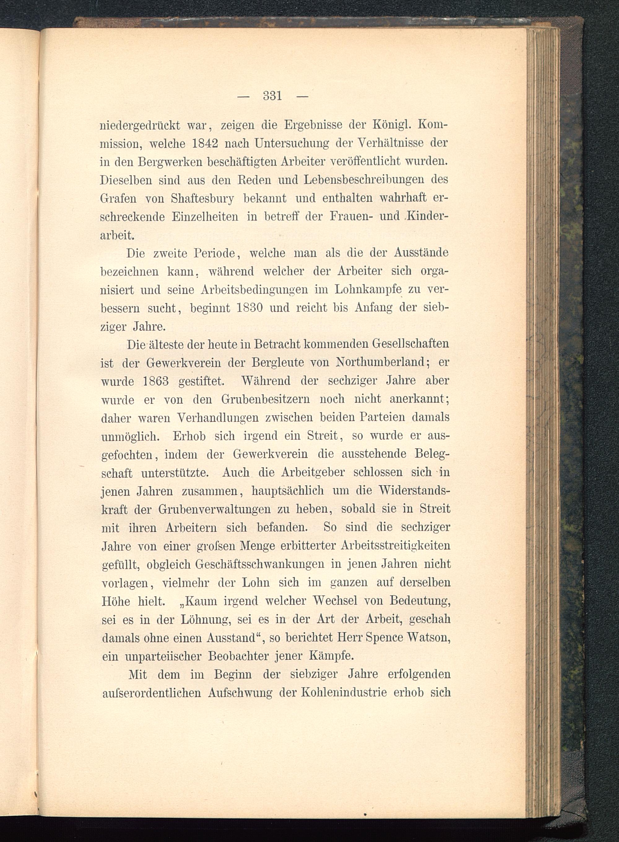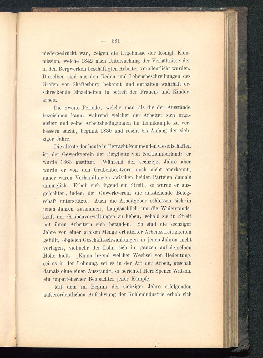 Die älteste der heute in Betracht kommenden Gesellschaftenist der Gewerkverein der Bergleute von Northumberland ; erwurde 1863 gestiftet. Während der sechziger Jahre aberwurde er von den Grubenbesitzern noch nicht anerkannt;daher waren Verhandlungen zwischen beiden Parteien damalsunmöglich. Erhob sich irgend ein Streit, so wurde er aus-gefochten, indem der Gewerkverein die ausstehende Beleg-schaft unterstützte. Auch die Arbeitgeber schlössen sich injenen Jahren zusammen, hauptsächlich um die Widerstands-kraft der Gruben Verwaltungen zu heben, sobald sie in Streitmit ihren Arbeitern sich befanden. So sind die sechzigerJahre von einer grofsen Menge erbitterter Arbeitsstreitigkeitengefüllt, obgleich Geschäftsschwankungen in jenen Jahren nichtvorlagen, vielmehr der Lohn sich im ganzen auf derselbenHöhe hielt. „Kaum irgend welcher Wechsel von Bedeutung,sei es in der Löhnung, sei es in der Art der Arbeit, geschahdamals ohne einen Ausstand", so berichtet Herr Spence Watson,ein unparteiischer Beobachter jener Kämpfe.