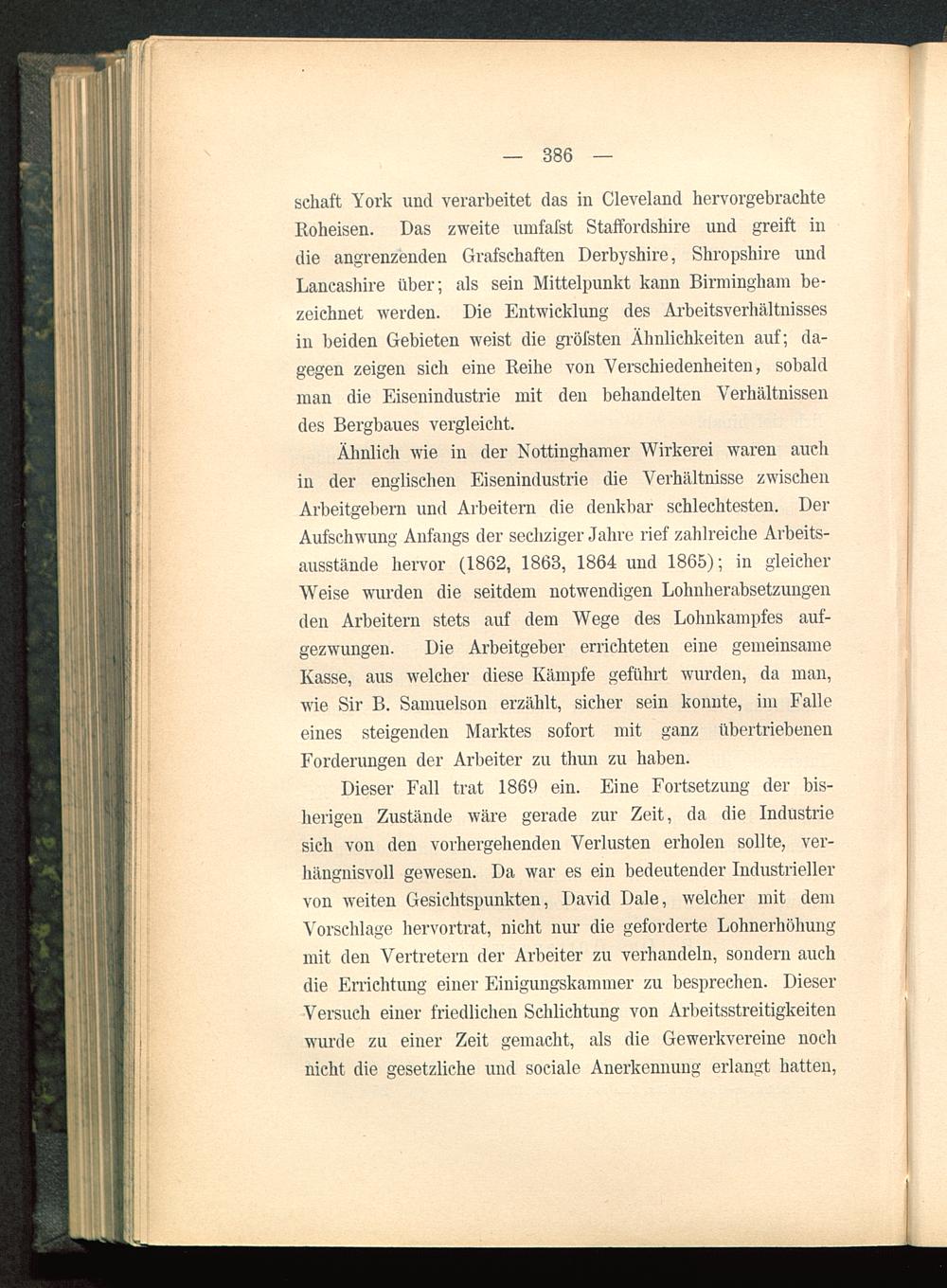 Dieser Fall trat 1869 ein. Eine Fortsetzung der bis-herigen Zustände wäre gerade zur Zeit, da die Industriesich von den vorhergehenden Verlusten erholen sollte, ver-hängnisvoll gewesen. Da war es ein bedeutender Industriellervon weiten Gesichtspunkten, David Dale, welcher mit demVorschlage hervortrat, nicht nur die geforderte Lohnerhöhungmit den Vertretern der Arbeiter zu verhandeln, sondern auchdie Errichtung einer Einigungskammer zu besprechen. DieserVersuch einer friedlichen Schlichtung von Arbeitsstreitigkeitenwurde zu einer Zeit gemacht, als die Gewerkvereine nochnicht die gesetzliche und sociale Anerkennung erlangt hatten,