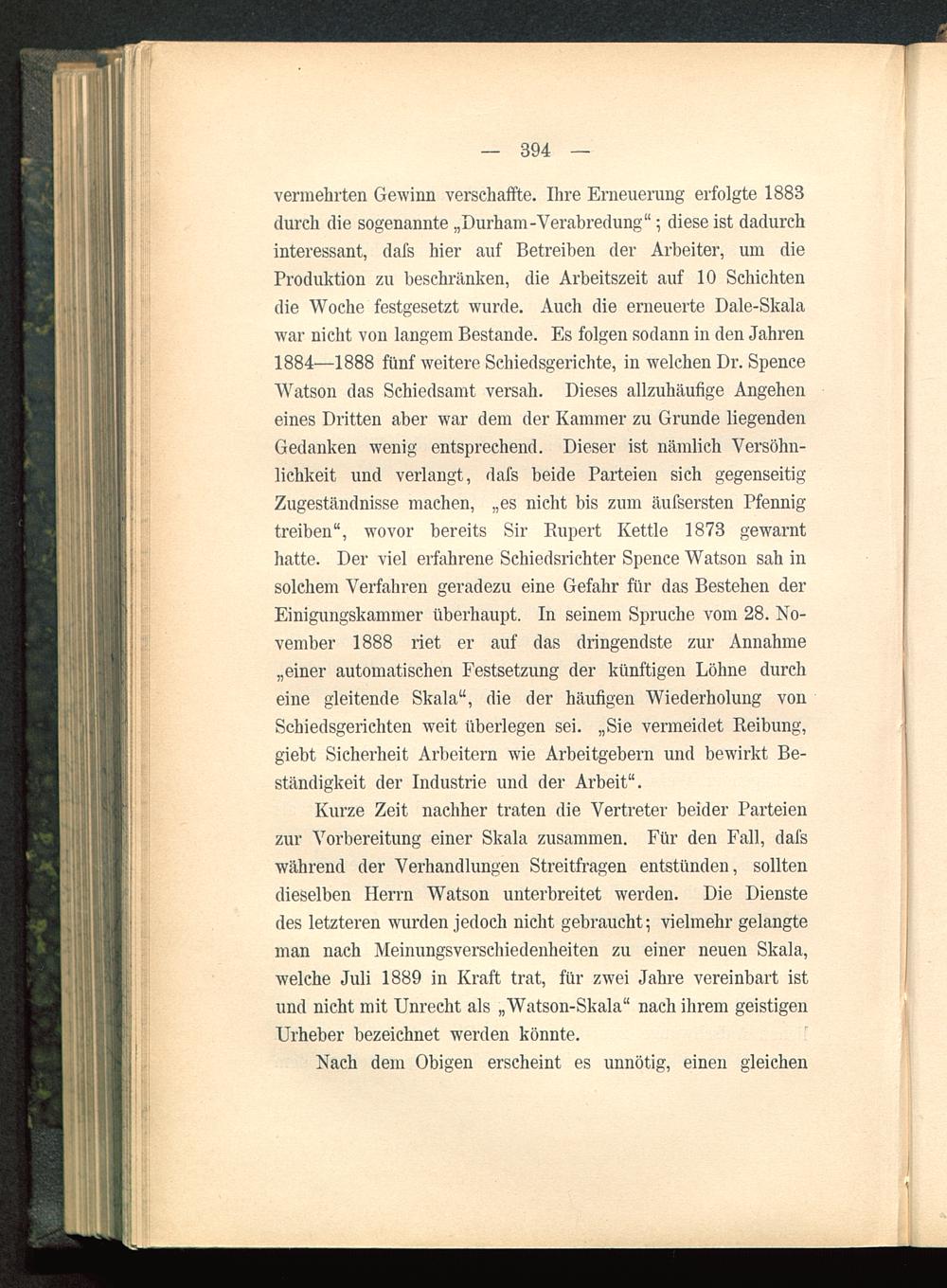 vermehrten Gewinn verschaffte. Ihre Erneuerung erfolgte 1883durch die sogenannte „Durham-Verabredung"; diese ist dadurchinteressant, dafs hier auf Betreiben der Arbeiter, um dieProduktion zu beschränken, die Arbeitszeit auf 10 Schichtendie Woche festgesetzt wurde. Auch die erneuerte Dale-Skalawar nicht von langem Bestände. Es folgen sodann in den Jahren1884—1888 fünf weitere Schiedsgerichte, in welchen Dr. SpenceWatson das Schiedsamt versah. Dieses allzuhäufige Angeheneines Dritten aber war dem der Kammer zu Grunde liegendenGedanken wenig entsprechend. Dieser ist nämlich Versöhn-lichkeit und verlangt, dafs beide Parteien sich gegenseitigZugeständnisse machen, „es nicht bis zum äufsersten Pfennigtreiben", wovor bereits Sir Rupert Kettle 1873 gewarnthatte. Der viel erfahrene Schiedsrichter Spence Watson sah insolchem Verfahren geradezu eine Gefahr für das Bestehen derEinigungskammer überhaupt. In seinem Spruche vom 28. No-vember 1888 riet er auf das dringendste zur Annahme„einer automatischen Festsetzung der künftigen Löhne durcheine gleitende Skala", die der häufigen Wiederholung vonSchiedsgerichten weit überlegen sei. „Sie vermeidet Reibung,giebt Sicherheit Arbeitern wie Arbeitgebern und bewirkt Be-ständigkeit der Industrie und der Arbeit".
