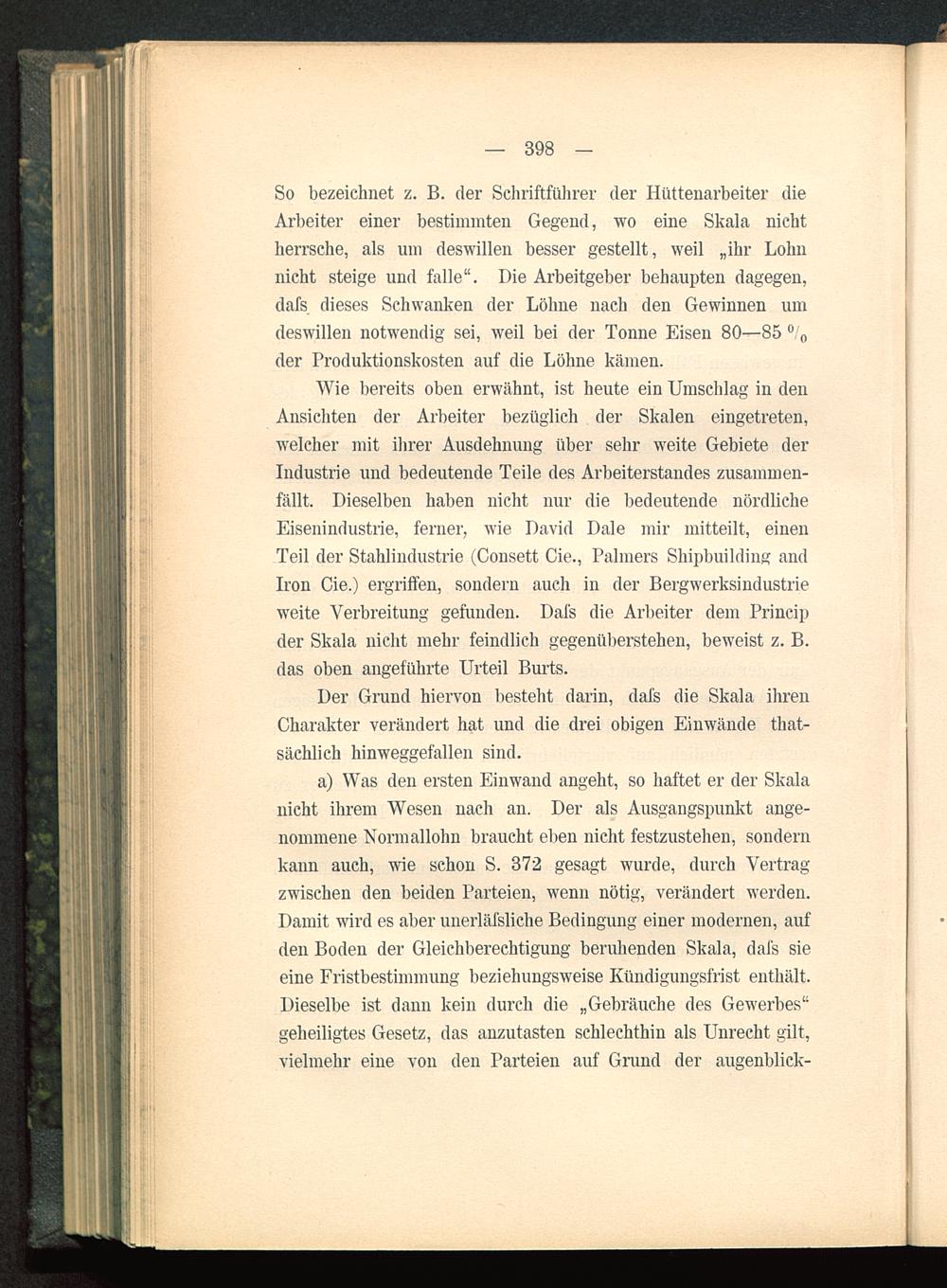 Wie bereits oben erwähnt, ist heute ein Umschlag in denAnsichten der Arbeiter bezüglich der Skalen eingetreten,welcher mit ihrer Ausdehnung über sehr weite Gebiete derIndustrie und bedeutende Teile des Arbeiterstandes zusammen-fällt. Dieselben haben nicht nur die bedeutende nördlicheEisenindustrie, ferner, wie David Dale mir mitteilt, einenTeil der Stahlindustrie (Consett Cie., Palmers Shipbuilding andIron Cie.) ergriffen, sondern auch in der Bergwerksindustrieweite Verbreitung gefunden. Dafs die Arbeiter dem Principder Skala nicht mehr feindlich gegenüberstehen, beweist z. B.das oben angeführte Ui'teil Burts.