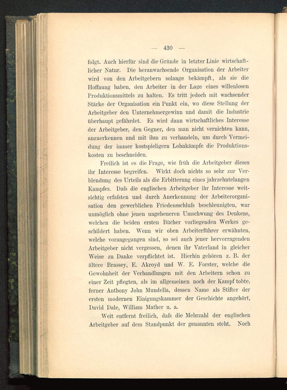 Freilich ist es die Frage, wie früh die Arbeitgeber diesesihr Interesse begreifen. Wirkt doch nichts so sehr zur Ver-blendung des Urteils als die Erbitterung eines jahrzehntelangenKampfes. Dafs die englischen Arbeitgeber ihr Interesse weit-sichtig erfafsten und durch Anerkennung der Arbeiterorgani-sation den gewerblichen Friedenssehlufs beschleunigten, warunmöglich ohne jenen ungeheueren Umschwung des Denkens,welchen die beiden ersten Bücher vorliegenden Werkes ge-schildert haben. Wenn wir oben Arbeiterführer erwähnten,welche vorangegangen sind, so sei auch jener hervorragendenArbeitgeber nicht vergessen, denen ihr Vaterland in gleicher-weise zu Danke verpflichtet ist. Hierhin gehören z. B. derältere Brassey, E. Akroyd und W. E. Forster , welche dieGewohnheit der Verhandlungen mit den Arbeitern schon zueiner Zeit pflegten, als im allgemeinen noch der Kampf tobte,ferner Anthony John Mundella , dessen Name als Stifter derersten modernen Einigungskammer der Geschichte angehört,David Dale, William Mather u. a.