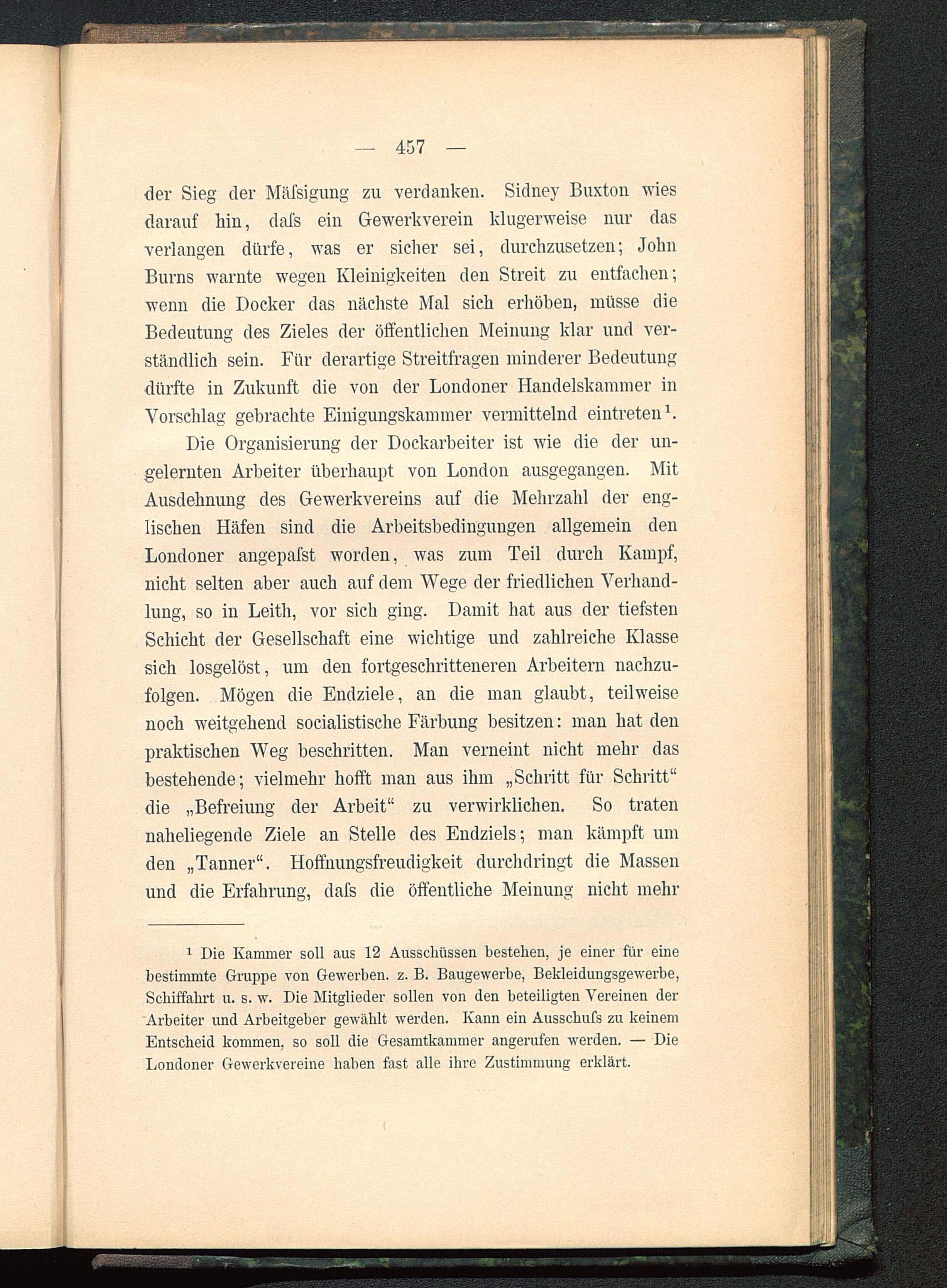 Die Organisierung der Dockarbeiter ist wie die der un-gelernten Arbeiter überhaupt von London ausgegangen. MitAusdehnung des Gewerkvereins auf die Mehrzahl der eng-lischen Häfen sind die Arbeitsbedingungen allgemein denLondoner angepafst worden, was zum Teil durch Kampf,nicht selten aber auch auf dem Wege der friedlichen Verhand-lung, so in Leith, vor sich ging. Damit hat aus der tiefstenSchicht der Gesellschaft eine wichtige und zahlreiche Klassesich losgelöst, um den fortgeschritteneren Arbeitern nachzu-folgen. Mögen die Endziele, an die man glaubt, teilweisenoch weitgehend socialistische Färbung besitzen: man hat denpraktischen Weg beschritten. Man verneint nicht mehr dasbestehende; vielmehr hofft man aus ihm „Schritt für Schritt"die „Befreiung der Arbeit" zu verwirklichen. So tratennaheliegende Ziele an Stelle des Endziels; man kämpft umden „Tanner". Hoffnungsfreudigkeit durchdringt die Massenund die Erfahrung, dafs die öffentliche Meinung nicht mehr