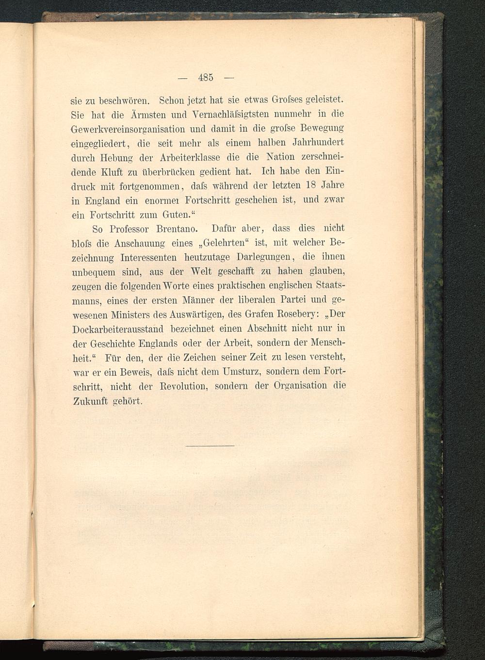 sie zu beschwören. Schon jetzt hat sie etwas Grolses geleistet.Sie hat die Ärmsten und Vernachläfsigtsten nunmehr in dieGewerkvereinsorganisation und damit in die grofse Bewegungeingegliedert, die seit mehr als einem halben Jahrhundertdurch Hebung der Arbeiterklasse die die Nation zerschnei-dende Kluft zu überbrücken gedient hat. Ich habe den Ein-druck mit fortgenommen, dafs während der letzten 18 Jahrein England ein enormei Fortschritt geschehen ist, und zwarein Fortschritt zum Guten."