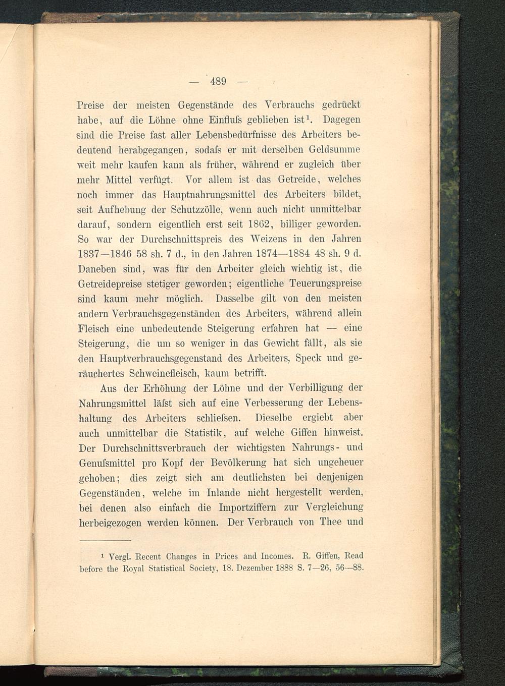 Preise der meisten Gegenstände des Verbrauchs gedrückthabe, auf die Löhne ohne Einflufs geblieben ist 1 . Dagegensind die Preise fast aller Lebensbedürfnisse des Arbeiters be-deutend herabgegangen, sodafs er mit derselben Geldsummeweit mehr kaufen kann als früher, während er zugleich übermehr Mittel verfügt. Vor allem ist das Getreide, welchesnoch immer das Hauptnahrungsmittel des Arbeiters bildet,seit Aufhebung der Schutzzölle, wenn auch nicht unmittelbardarauf, sondern eigentlich erst seit 1862, billiger geworden.So war der Durchschnittspreis des Weizens in den Jahren1837—1846 58 sh. 7 d., in den Jahren 1874—1884 48 sh. 9 d.Daneben sind, was für den Arbeiter gleich wichtig ist, dieGetreidepreise stetiger geworden; eigentliche Teuerungspreisesind kaum mehr möglich. Dasselbe gilt von den meistenandern Verbrauchsgegenständen des Arbeiters, während alleinFleisch eine unbedeutende Steigerung erfahren hat — eineSteigerung, die um so weniger in das Gewicht fällt, als sieden Hauptverbrauchsgegenstand des Arbeiters, Speck und ge-räuchertes Schweinefleisch, kaum betrifft.