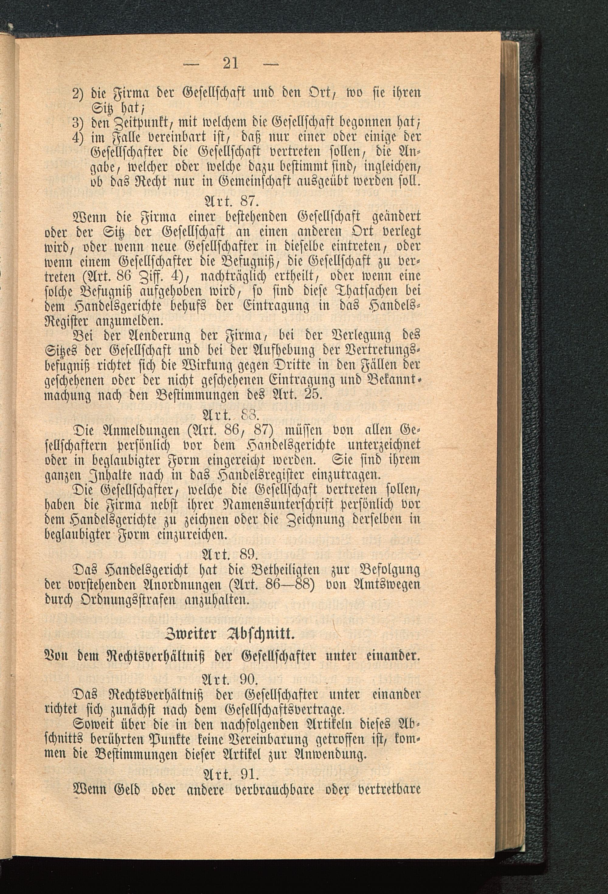 Wenn die Firma einer bestehenden Gesellschaft geändertoder der Sitz der Gesellschaft an einen anderen Ort verlegtwird/ oder wenn neue Gesellschafter in dieselbe eintreten/ oderwenn einem Gesellschafter die Befugnis// die Gesellschaft zu ver-treten (Art. 86 Ziff. 4)/ nachträglich ertheilt/ oder wenn einesolche Befugniß aufgehoben wird/ so sind diese Thatsachen beidem Handelsgerichte behufs der Eintragung in das Handels-Register anzumelden.