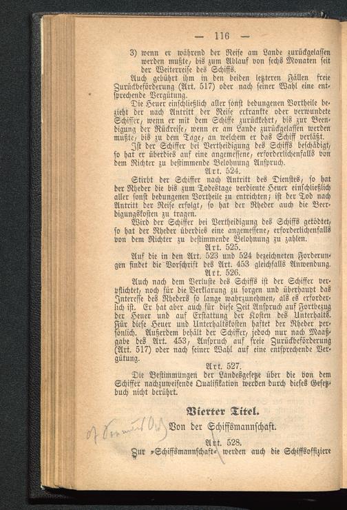 Die Heuer einschließlich aller sonst bedungenen Vortheile be-zieht der nach Antritt der Reife erkrankte oder verwundeteSchiffer, wenn er mit dem Schiffe zurückkehrt, bis zur Been-digung der Rückreise, wenn er am Lande zurückgelassen werdenmußte, bis zu dem Tage, an welchem er das Schiff verläßt.
