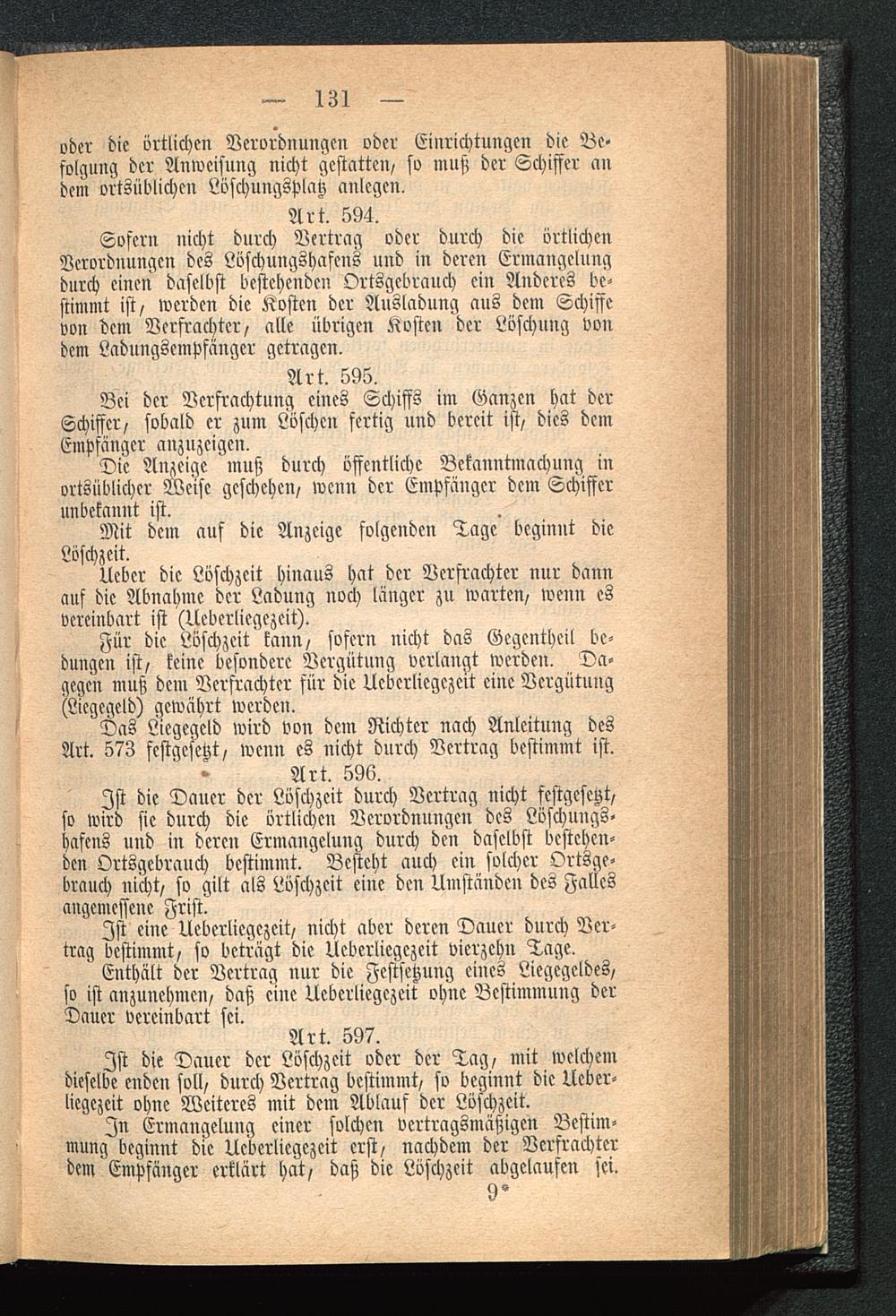 Für die Löschzeit kann/ sofern nicht das Gegentheil be-dungen ist/ keine besondere Vergütung verlangt werden. Da-gegen muß dem Verfrachter für die Uebcrliegezcit ciuc Vergütung(Liegegeld) gewährt werden.
