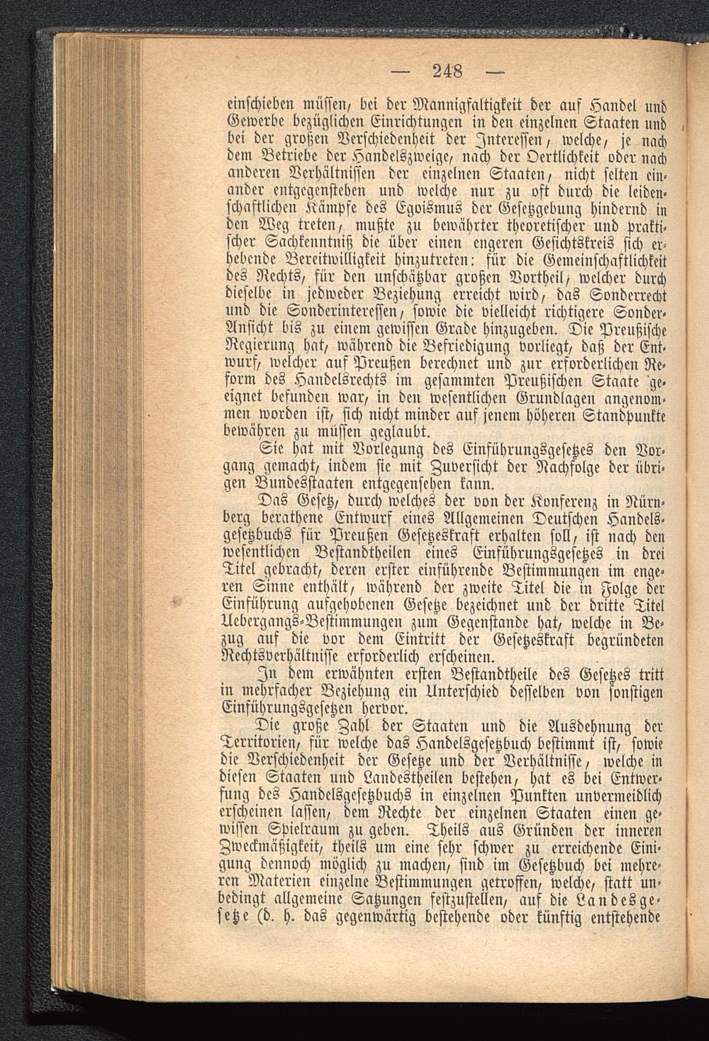 Das Gesetz/ durch welches der von der Konferenz in Nürn-berg berathene Entwurf eines Allgemeinen Deutschen Handels-gesetzbuchs für Preußen Gesetzeskraft erhalten soll/ ist nach dc»wesentlichen Bestandtheilen eines Einführungsgesetzcs in dreiTitel gebracht/ deren erster einführende Bestimmungen im enge-ren Sinne enthält/ während der zweite Titel die in Folge derEinführung aufgehobenen Gesetze bezeichnet und der dritte TitelUcbergangs-Bestimmungen zum Gegenstände hat/ welche in Be-zug auf die vor dem Eintritt der Gesetzeskraft begründetenRechtsverhältnisse erforderlich erscheinen.