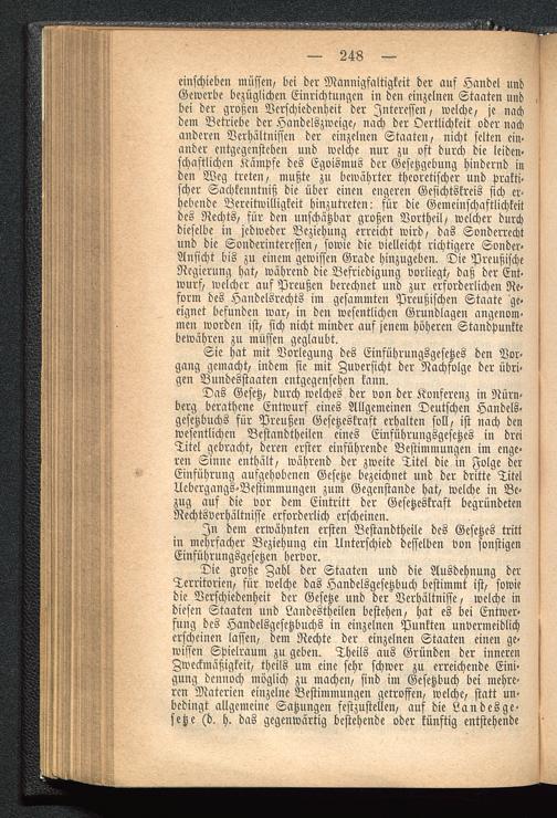 Die große Zahl der Staaten und die Ausdehnung derTerritorien/ für welche das Handelsgesetzbuch bestimmt ist/ sowiedie Verschiedenheit der Gesetze und der Verhältnisse/ welche indiesen Staaten und Landestheilen bestehen/ hat es bei Entwer-fung des Handelsgesetzbuchs in einzelnen Punkten unvermeidlicherscheinen lassen/ dem Rechte der einzelnen Staaten einen ge-wissen Spielraum zu geben. Theils aus Gründen der innerenZweckmäßigkeit/ theils um eine sehr schwer zu erreichende Eini-gung dennoch möglich zu machen/ sind im Gesetzbuch bei mehre-ren Materien einzelne Bestimmungen getroffen/ welche/ statt un-bedingt allgemeine Satzungen festzustellen/ auf die Landcsge-setze (d. h. das gegenwärtig bestehende oder künftig entstehende