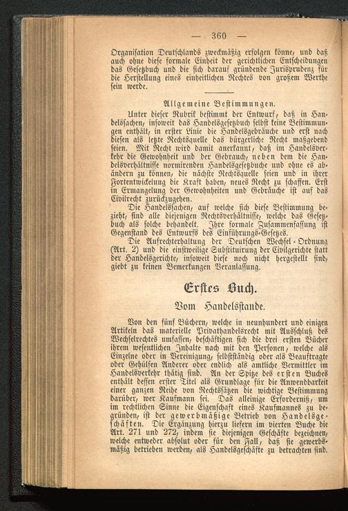 Von den fünf Büchern, welche in neunhundert und einigenArtikeln das materielle Privathandelsrecht mit Ausschluß desWechselrechtes umfassen, beschäftigen sich die drei ersten Bücherihrem wesentlichen Inhalte nach mit den Personen, welche alsEinzelne oder in Vereinigung, sclbstständig oder als Beauftragteoder Gehülfen Anderer oder endlich als amtliche Vermittler imHandelsverkehr thätig sind. An der Spitze des ersten Bnchesenthält dessen erster Titel als Grundlage für die Anwendbarkeiteiner ganzen Reihe von Rechtssätzen die wichtige Bestimmungdarüber, wer Kaufmann sei. Das alleinige Erforderniß, umim rechtlichen Sinne die Eigenschaft eines Kaufmannes zu be-gründen, ist der gew er bmäßige Betrieb von Handelsge-schästen. Die Ergänzung hierzu liefern im vierten Buche dieArt. 271 und 272, indem sie diejenigen Geschäfte bezeichnen,welche entweder absolut oder für den Fall, daß sie gewerbs-mäßig betrieben werden, als Handelsgeschäfte zu betrachten sind.