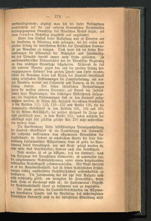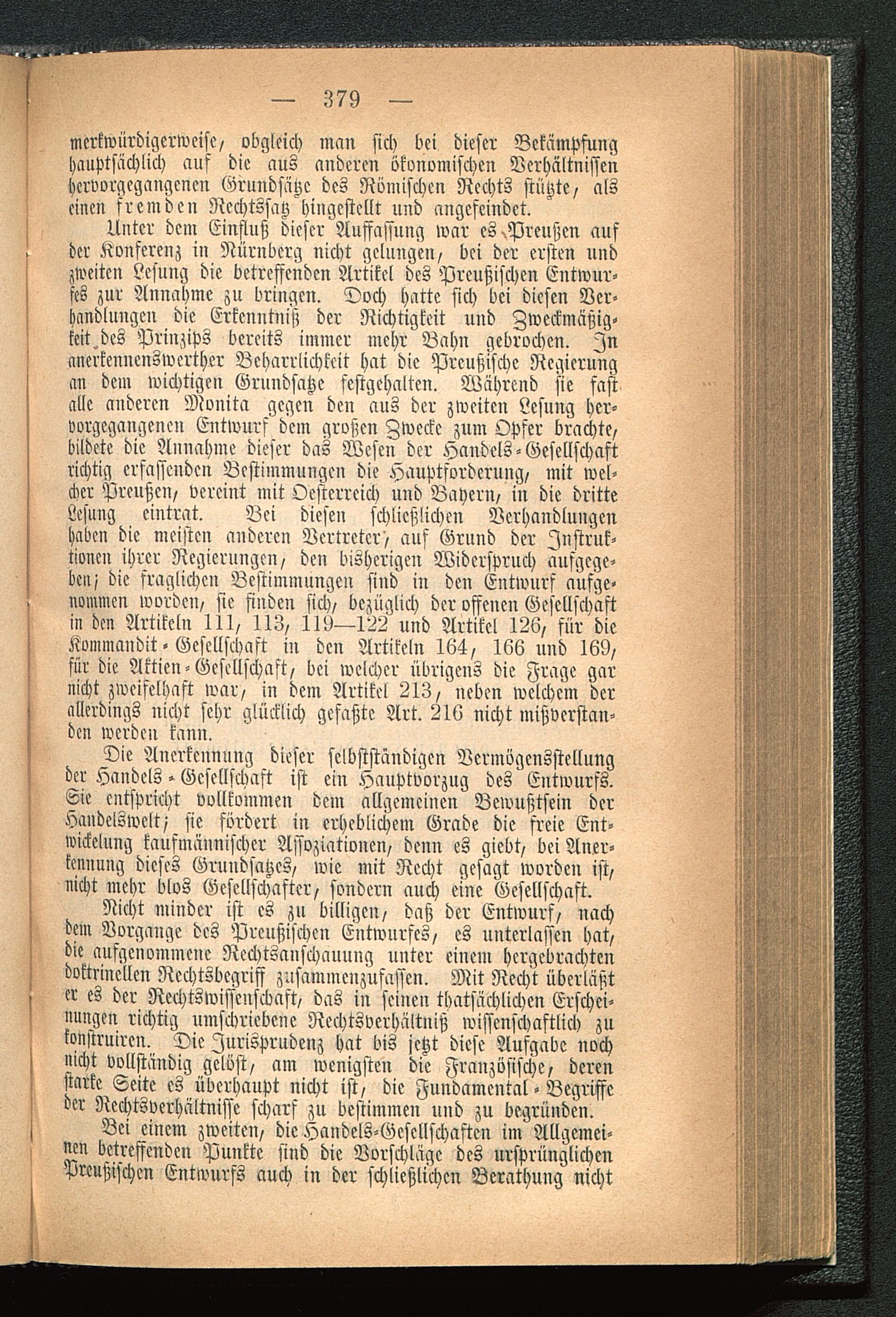 Unter dem Einfluß dieser Auffassung war cs^Preußcn aufder Konferenz in Nürnberg nicht gelungen/ bei der ersten undzweiten Lesung die betreffenden Artikel des Preußischen Entwur-fes zur Annahme zu bringen. Doch hatte sich bei diesen Ver-handlungen die Erkenntniß der Richtigkeit und Zweckmäßig-keit.des Prinzips bereits immer mehr' Bahn gebrochen. Inanerkennenswerther Beharrlichkeit hat die Preußische Regierungan dem wichtigen Grundsätze festgehalten. Während sie fastalle anderen Mvnita gegen den aus der zweiten Lesung her-vorgegangeneu Entwurf dem großen Zwecke zum Opfer brachte/bildete die Annahme dieser das Wesen der Handels-Gesellschaftrichtig erfassenden Bestimmungen die Hauptforderung/ mit wel-cher Preußen/ vereint mit Oesterreich und Bayern / in die dritteLesung eintrat. Bei diesen schließlichen Verhandlungenhaben die meisten anderen Vertreter/ auf Grund der Instruk-tionen ihrer Regierungen/ den bisherigen Widerspruch aufgege-ben/ die fraglichen Bestimmungen sind in den Entwurf aufge-nommen worden/ sie finden sich/ bezüglich der offenen Gesellschaftin den Artikeln 111/ 113/ 119—122 und Artikel 126/ für dieKommandit - Gesellschaft in den Artikeln 164/ 166 und 169/für die Aktien-Gesellschaft/ bei welcher übrigens die Frage garnicht zweifelhaft war/ in dem Artikel 213/ neben welchem derallerdings nicht sehr glücklich gefaßte Art. 216 nicht mißverstan-den werden kann.