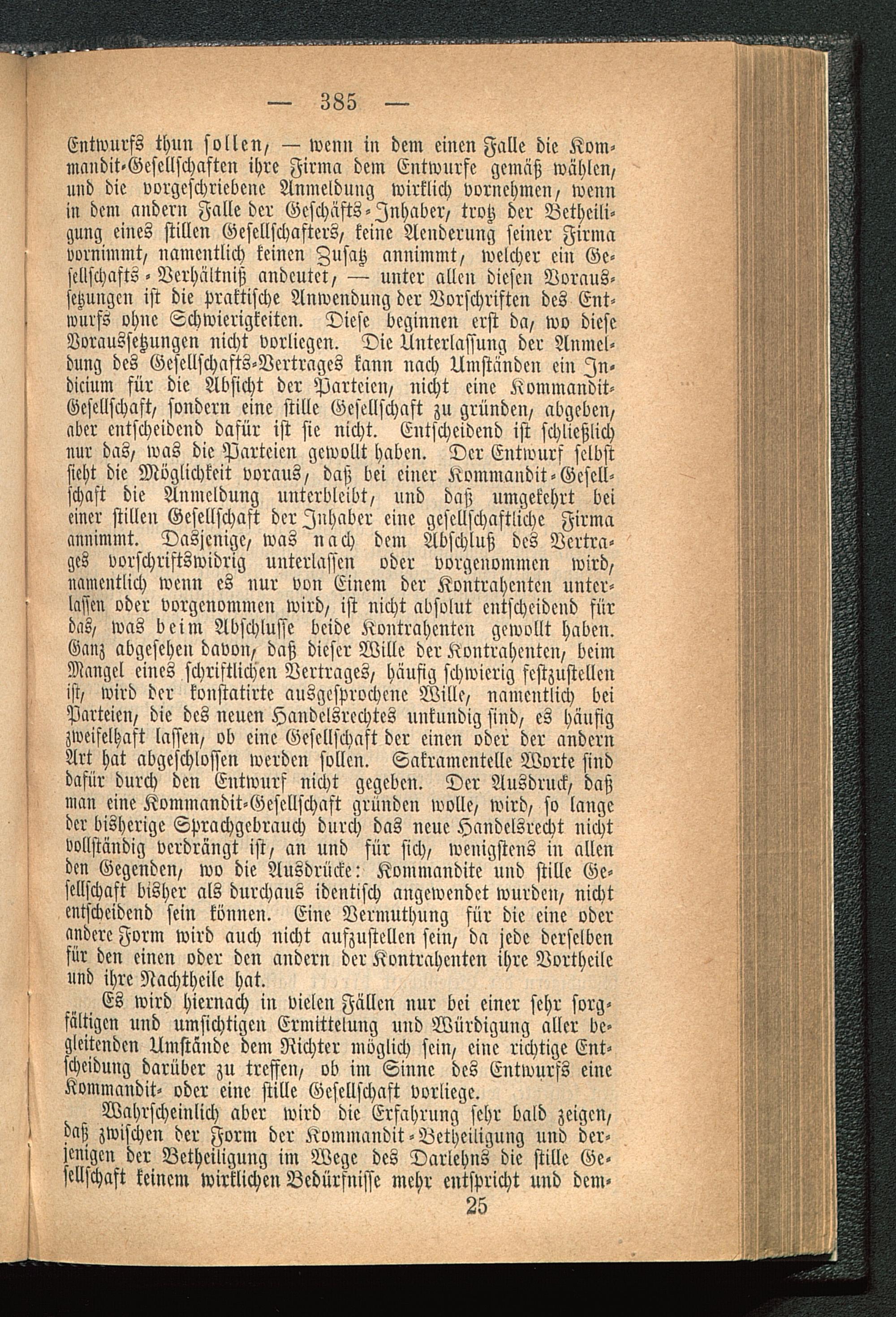 Entwurfs thun sollen/ — wenn in dem einen Falle die Kom-mandit-Gescllschaften ihre Firma dem Entwürfe gemäß wählen/und die vorgeschriebene Anmeldung wirklich vornehmen/ wennin dem andern Falle der Geschäfts-Inhaber/ trotz der Betheili-gung eines stillen Gesellschafters/ keine Aenderung seiner Firmavornimmt/ namentlich keinen Zusatz annimmt/ welcher ein Ge-sellschafts - Verhältniß andeutet/ — unter allen diesen Voraus-setzungen ist die praktische Anwendung der Vorschriften des Ent-wurfs ohne Schwierigkeiten. Diese beginnen erst da/ wo dieseVoraussetzungen nicht vorliegen. Die Unterlassung der Anmel-dung des Gcscllschasts-Vertrages kann nach Umständen ein In-dicium für die Absicht der Parteien/ nicht eine Kvuuuandit-Gesellschaft, sondern eine stille Gesellschaft zu gründen/ abgeben/aber entscheidend dafür ist sie nicht. Entscheidend ist schließlichnur das/ was die Parteien gewollt haben. Der Entwurf selbstsieht die Möglichkeit voraus, daß bei einer itommaudit-Gesell-schaft die Anmeldung unterbleibt, und daß umgekehrt beieiner stillen Gesellschaft der Inhaber eine gesellschaftliche Firmaannimmt. Dasjenige, was nach dem Abschluß des Vertra-ges vorschriftswidrig unterlassen oder vorgenommen wird,namentlich wenn es nur von Einem der Kontrahenten unter-lassen oder vorgenommen wird, ist nicht absolut entscheidend fürdas, was beim Abschlüsse beide Kontrahenten gewollt haben.Ganz abgesehen davon, daß dieser Wille der Kontrahenten, beimMangel eines schriftlichen Vertrages, häufig schwierig festzustellenist, wird der konstatirtc ausgesprochene Wille, namentlich beiParteien, die des neuen Handelsrechtes unkundig find, es häufigzweifelhaft lassen, ob eine Gesellschaft der einen oder der andernArt hat abgeschlossen werden sollen. Sakramentelle Worte sinddafür durch den Entwurf nicht gegeben. Der Ausdruck, daßman eine Kommandit-Gesellschast gründen wolle, wird, so langeder bisherige Sprachgebrauch durch das neue Handelsrecht nichtvollständig verdrängt ist, an und für sich, wenigstens in allenden Gegenden, wo die Ausdrücke: Kommanditc und stille Ge-sellschaft bisher als durchaus identisch angewendet wurden, nichtentscheidend sein können. Eine Vermuthung für die eine oderandere Form wird auch nicht aufzustellen sein, da jede derselbenfür den einen oder den andern der Kontrahenten ihre Vortheileund ihre Nachtheile hat.