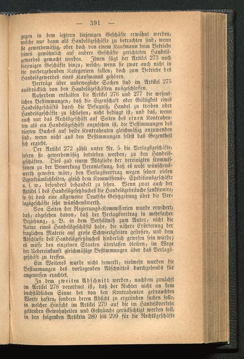 Der Artikel 272 zählt unter Nr. 5 die Vcrlagsgeschäfte,sofern sie gewerbemäßig betrieben werden, zu den Handels-geschäften. Dies gab einem Mitgliedc der vereinigten Kommis-sionen zn der Bemerkung Veranlassung, daß es wohl wünschens-wert!) gewesen wäre, den Verlagsvcrtrag wegen seiner vielenEigenthümlichkeiten, gleich dem Kommissions -, Speditionsgeschäfteu. s. w-, besonders behandelt zu sehen. Wenn zwar cinch derArtikel 1 des Handelsgesetzbuches die Handelsgcbränche sanktionire,so sei doch eine allgemeine Deutsche Gesetzgebung über die Vcr-lagsgeschäfte sehr wünschenswerth.