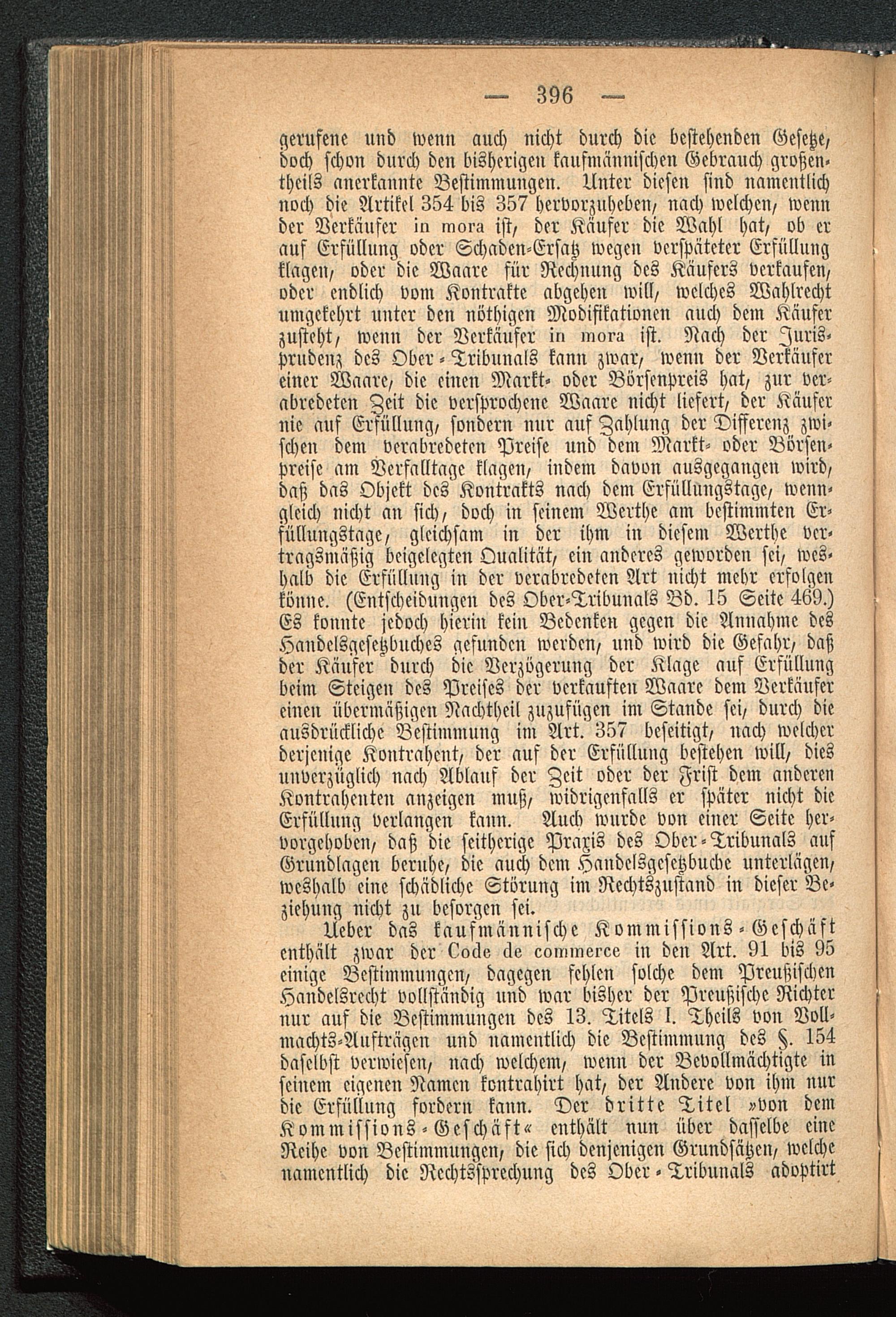 gerufene und wenn auch nicht durch die bestehenden Gesetze/doch schon durch den bisherigen kaufmännischen Gebrauch große»,theils anerkannte Bestimmungen. Unter diesen sind namentlichnoch die Artikel 354 bis 357 hervorzuheben/ nach welchen/ wennder Verkäufer in mors ist/ der Käufer die Wahl hat/ ob erauf Erfüllung oder Schaden-Ersatz wegen verspäteter Erfüllungklage»/ oder "die Waare für Rechnung des Käufers verkaufen,oder endlich vom Kontrakte abgehen will, welches Wahlrechtumgekehrt unter den nöthigen Modifikationen auch dem Käuferzusteht, wenn der Verkäufer in moi-a ist. Nach der Juris-prudenz des Ober-Tribunals kann zwar, wenn der Verkäufereiner Waare, die einen Markt- oder Börsenpreis hat, zur ver-abredeten Zeit die versprochene Waare nicht liefert, der Käufernie auf Erfüllung, sondern nur auf Zahlung der Differenz zwi-schen dem verabredeten Preise und dem Markt- oder Börsen-preise am Verfalltage klagen, indem davon ausgegangen wird,daß das Objekt des Kontrakts nach dem Erfüllungstagc, wenn-gleich nicht an sich, doch in seinem Werthe am bestimmten Er-füllungstagc, gleichsam in der ihm in diesem Werthe ver-tragsmäßig beigelegten Qualität, ein anderes geworden sei, wes-halb die Erfüllung in der verabredeten Art nicht mehr erfolgenkönne. (Entscheidungen des Ober-Tribunals Bd. 15 Seite 469.)Es konnte jedoch hierin kein Bedenken gegen die Annahme desHandelsgesetzbuches gefunden werden, und wird die Gefahr, daßder Käufer "durch die Verzögerung der Klage auf Erfüllungbeim Steigen des Preises der verkauften Waare dem Verkäufereinen übermäßigen Nachtheil zuzufügen im Stande sei, durch dieausdrückliche Bestimmung im Art. 357 beseitigt, nach welcherderjenige Kontrahent, der auf der Erfüllung bestehen will, diesunverzüglich nach Ablauf der Zeit oder der Frist dem anderenKontrahenten anzeigen muß, widrigenfalls er später nicht dieErfüllung verlangen kann. Auch wurde von einer Seite her-vorgehoben, daß die seitherige Praxis des Ober-Tribunals aufGrundlagen beruhe, die auch dem Handelsgesetzbuche unterlägen,weshalb eine schädliche Störung im Rechtsznstand in dieser Be-ziehung nicht zu besorgen sei.