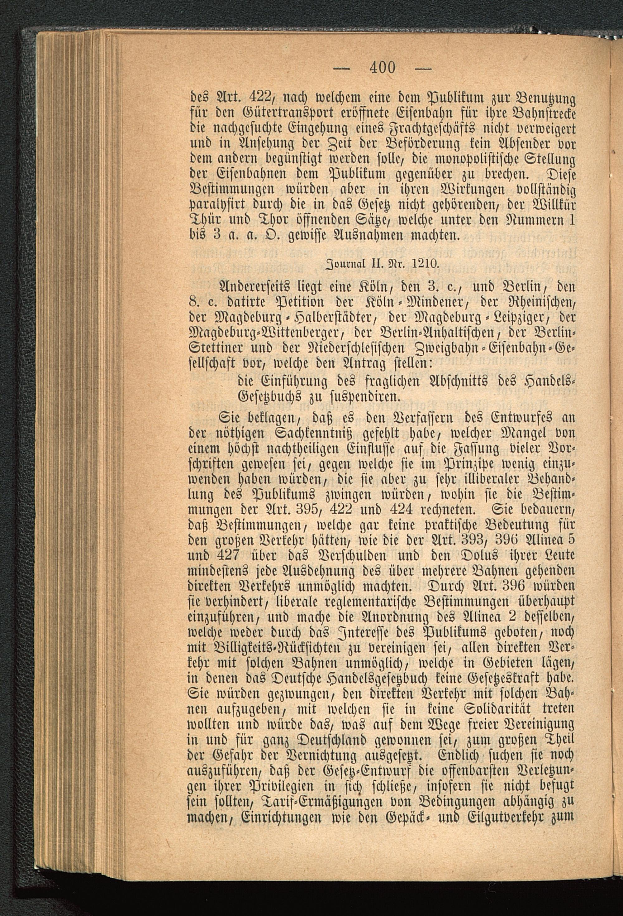 Sie beklagen, daß es den Verfassern des Entwurfes ander nöthigen Sachkenntniß gefehlt habe, welcher Mangel voneinem höchst nachthciligcn Einflüsse auf die Fassung vieler Vor-schriften gewesen sei, gegen welche sie im Prinzipe wenig einzu-wenden haben würden, die sie aber zu sehr illiberaler Behand-lung des Publikums zwingen würden, wohin sie die Bestim-mungen der Art. 395, 422 und 424 rechneten. Sie bedauern,daß Bestimmungen, welche gar keine praktische Bedeutung fürden großen Verkehr hätten, wie die der Art. 393, 390 Alinea 5und 427 über das Verschulden und den Dolus ihrer Leutemindestens jede Ausdehnung des über mehrere Bahnen gehendendirekten Verkehrs unmöglich machten. Durch Art. 396 würdensie verhindert, liberale reglementarische Bestimmungen überhaupteinzuführen, und mache die Anordnung des Alinea 2 desselben,welche weder durch das Interesse des Publikums geboten, nochmit Billigkeits-Nücksichten zu vereinigen sei, allen direkten Ver-kehr mit solchen Bahnen unmöglich, welche in Gebieten lägen,in denen das Deutsche Handelsgesetzbuch keine Gesetzeskraft habe.Sie würden gezwungen, den direkten Verkehr mit solchen Bah-nen aufzugeben, mit welchen sie in keine Solidarität tretenwollten und würde das, was auf dem Wege freier Vereinigungin und für ganz Deutschland gewonnen sei, zum großen Theilder Gefahr der Vernichtung ausgesetzt. Endlich suchen sie nochauszuführen, daß der Gesetz-Entwurf die offenbarsten Verletzun-gen ihrer Privilegien in sich schließe, insofern sie nicht befugtsein sollten, Tarif-Ermäßigungen von Bedingungen abhängig zumachen, Einrichtungen wie den Gepäck- und Eilgutverkehr zum