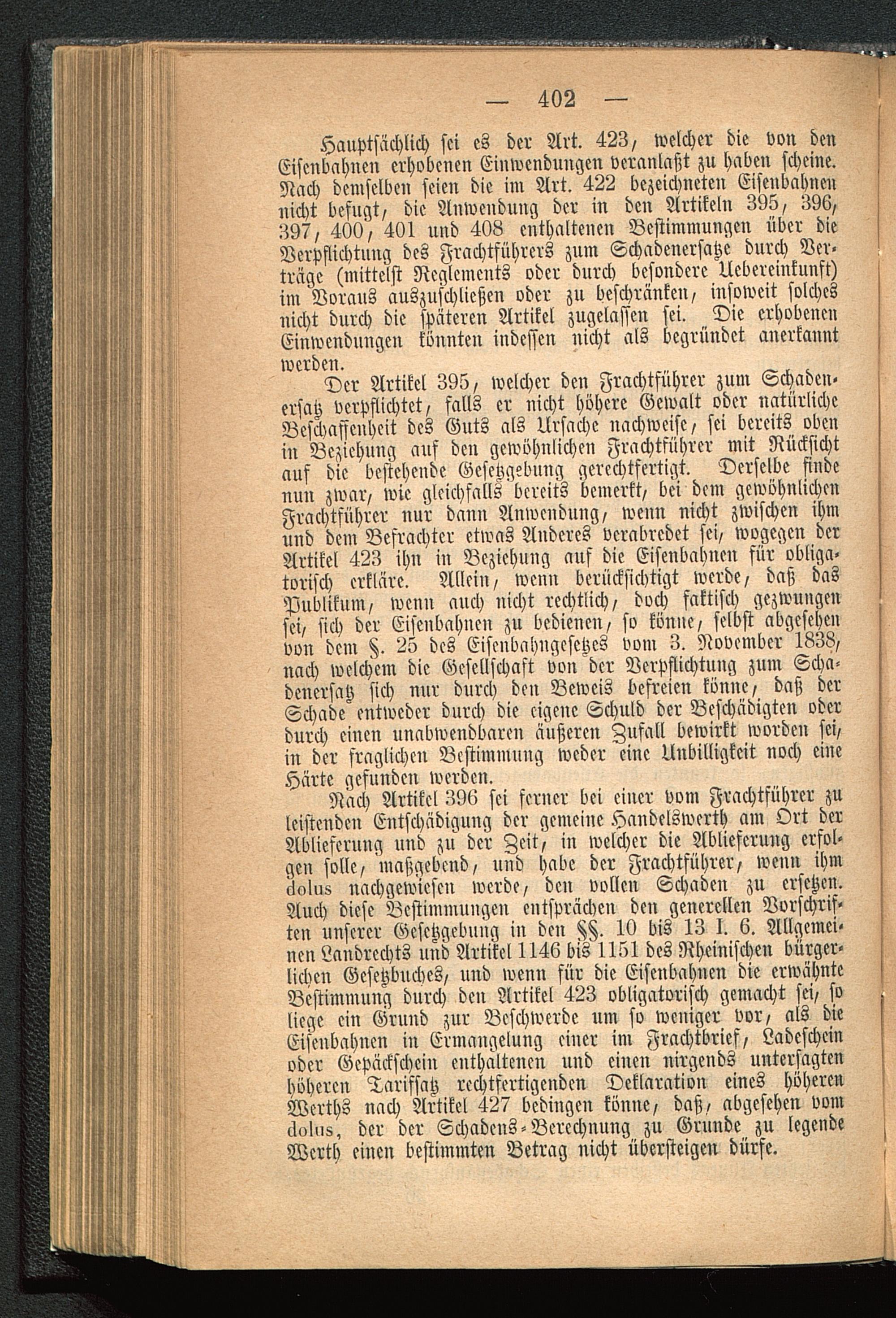 Eisenbahnen erhobenen Einwendungen veranlaßt zu haben scheine.Nach demselben seien die im Art. 422 bezeichneten Eisenbahnennicht befugt/ die Anwendung der in den Artikeln 395/ 396,397, 400, 401 und 408 enthaltenen Bestimmungen iihcr dieVerpflichtung des Frachtführers zum Schadenersätze durch Ver-träge (mittelst Ncglemcnts oder durch besondere Uebereil,kunft)im Voraus auszuschließen oder zu beschränken, insoweit solchesnicht durch die späteren Artikel zugelassen sei. Die erhobenenEinwendungen könnten indessen nicht als begründet anerkanntwerden.