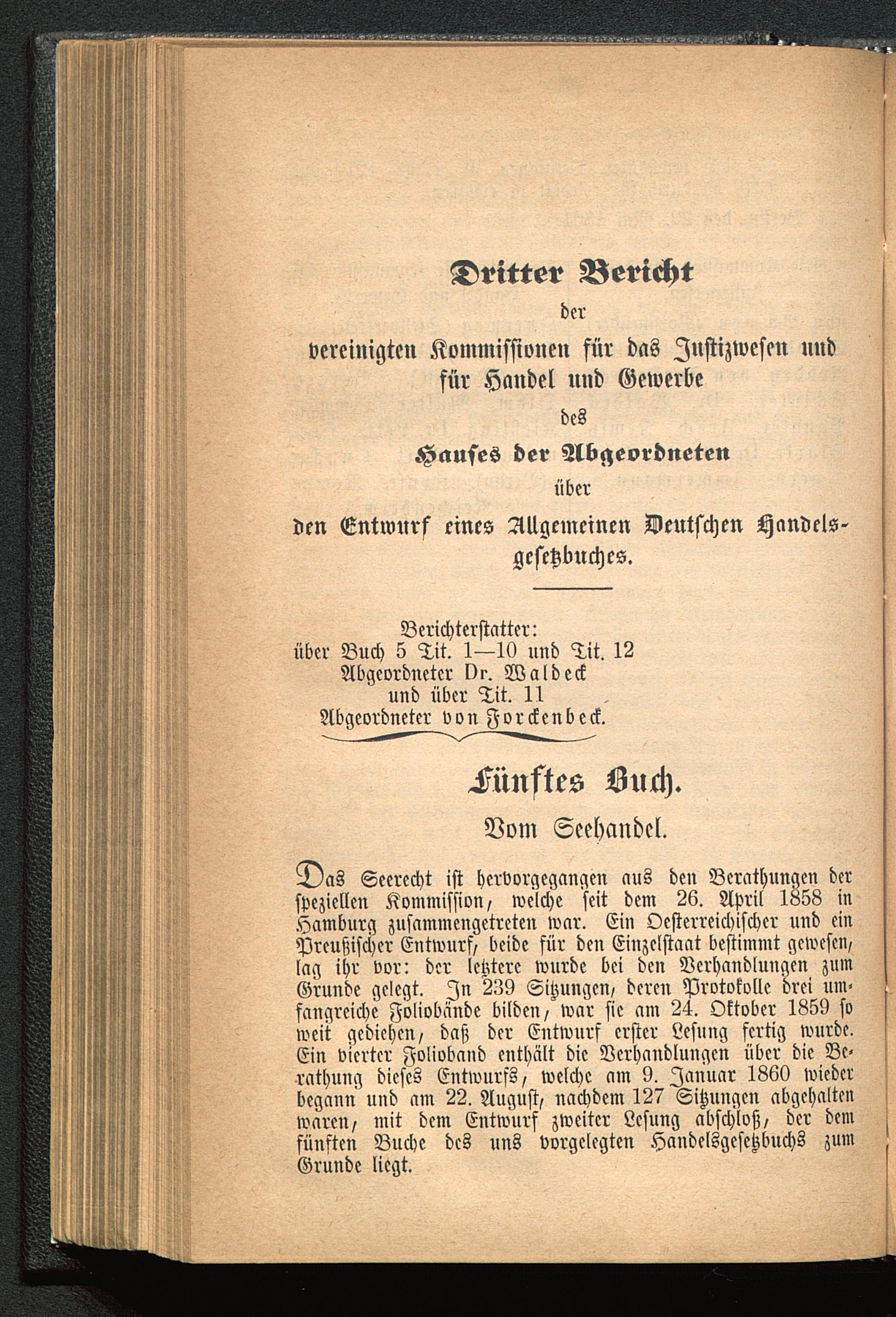 Aas Secrccht ist hervorgegangen aus den Berathungen derspeziellen Kommission, welche seit dem 26. April 1858 inHamburg zusammengetreten war. Ein Oesterreichischcr und einPreußischer Entwurf, beide für den Einzelstaat bestimmt gewesen,lag ihr vor: der letztere wurde bei den Verhandlungen zumGrunde gelegt. In ^99 Sitzungen, deren Protokolle drei um-fangreiche Foliobande bilden, war sie am 24. Oktober 1859 soweit gediehen, daß der Entwurf erster Lesung fertig wurde.Ein vierter Folioband enthält die Verhandlungen über die Be-rathung dieses Entwurfs, welche am 9. Januar 1860 wiederbegann und am 22. August, nachdem 127 Sitzungen abgehaltenwaren, mit dem Entwurf zweiter Lesung abschloß, der demfünften Buche des uns vorgelegten Handelsgesetzbuchs zumGrunde liegt.