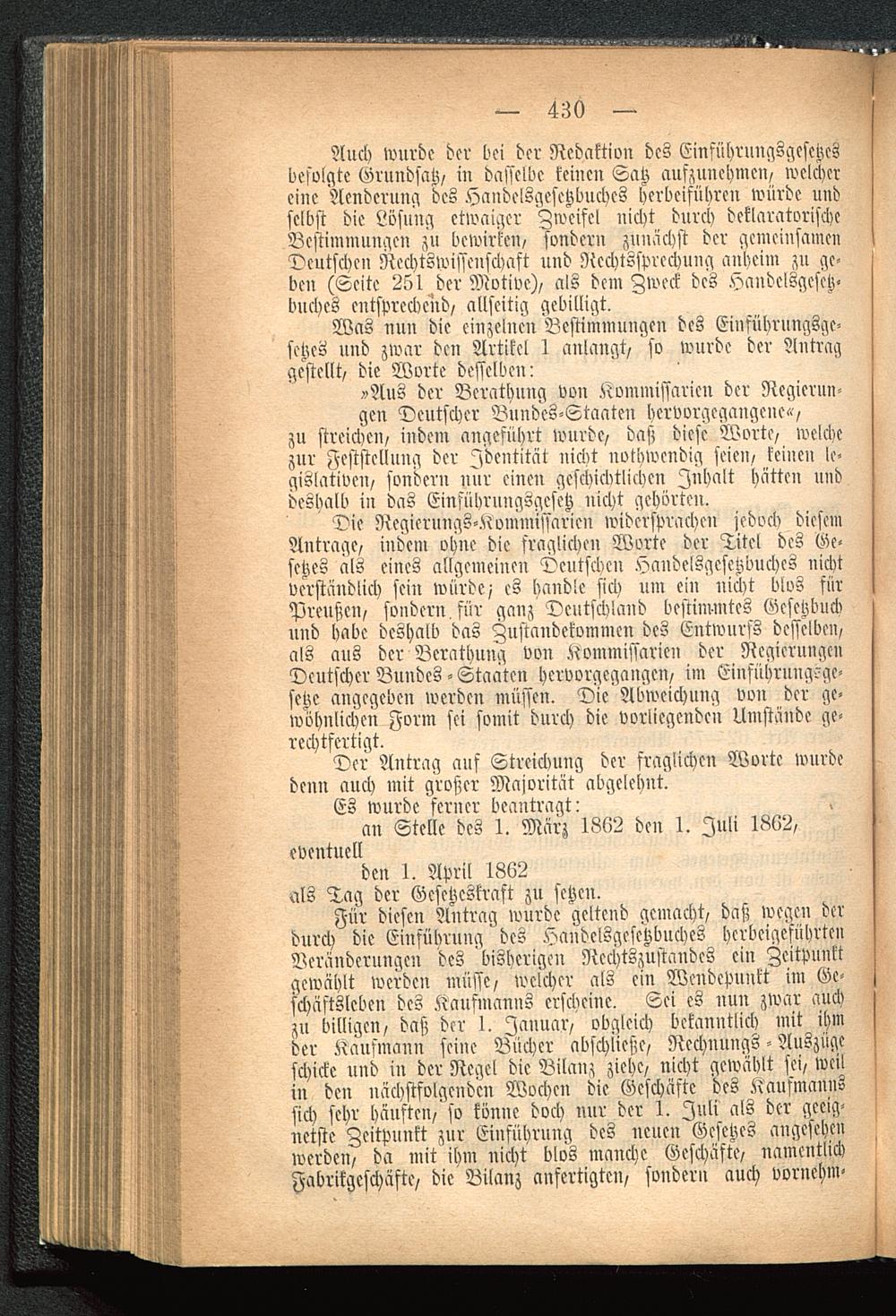 Für diesen Antrag wurde geltend gemacht, daß wegen derdurch die Einführung' des Handelsgesetzbuches herbeigeführtenVeränderungen des bisherigen Ncchtszuftandes ein Zeitpunktgewählt werden müsse, welcher als ein Wendepunkt im Ge-schäftsleben des Kaufmanns erscheine. Sei es nun zwar auchzu billigen, daß der I. Januar, obgleich bekanntlich mit ihmder Kaufmann seine Bücher abschließe, Rechnungs - Auszügeschicke und in der Regel die Bilanz ziehe, nicht gewählt sei, weilin den nächstfolgenden Wochen die Geschäfte des Kaufmannssich sehr häuften, so könne doch nur der 1. Juli als der geeig-netste Zeitpunkt zur Einführung des neuen Gesetzes angesehenwerden, da mit ihm nicht blos manche Geschäfte, namentlichFabrikgcschäfte, die Bilanz anfertigten, sondern auch vornehm-