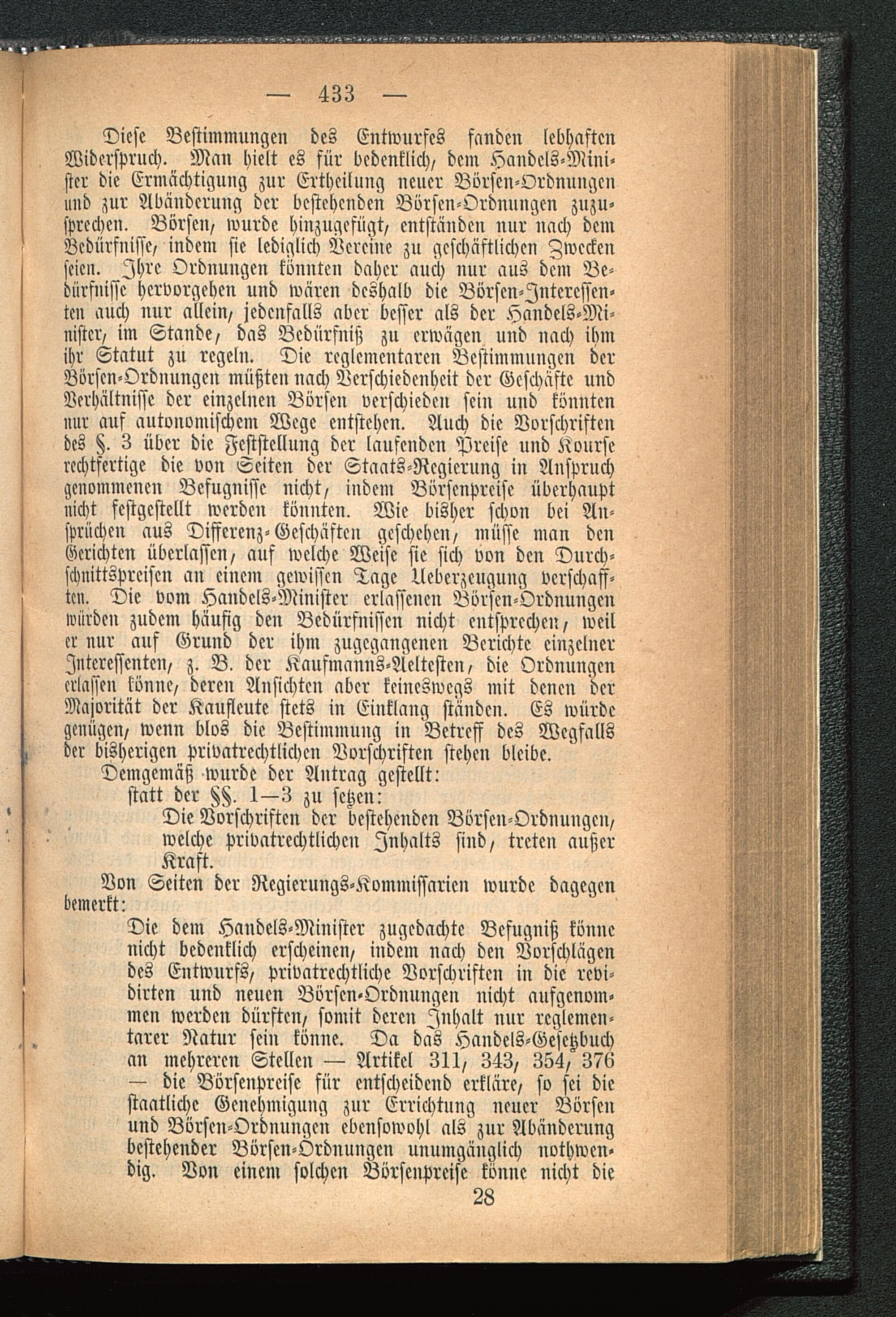 Dicse Bestimmungen des Entwurfes funden lebhaftenWiderspruch. Man hielt es für bedenklich/ dem Handels-Mini-ster die Ermächtigung zur Erthcilung neuer Börsen-Ordnungenund zur Abänderung der bestehenden Börsen-Ordnungen zuzu-sprechen. Börsen/ wurde hinzugefügt/ entständen nur nach demBedürfnisse/ indem sie lediglich Vereine zu geschäftlichen Zweckenseien. Ihre Ordnungen könnten daher auch nur aus dem Be-dürfnisse" hervorgehen und wären deshalb die Börsen-Interessen-ten auch nur allein/ jedenfalls aber besser als der Handels-Mi-nistcr, im Stande/ das Bedürfniß zu erwägen und nach ihmihr Statut zu regeln. Die reglcmentaren Bestimmungen derBörsen-Ordnungen müßten nach Verschiedenheit der Geschäfte undVerhältnisse der einzelnen Börsen verschieden sein und könntennur auf autonomischcm Wege entstehen. Auch die Vorschriftendes §. 3 über die Feststellung der laufenden Preise nnd Kourserechtfertige die von Seiten der Staats-Rcgierung in Anspruchgenommenen Befugnisse nicht/ indem Börsenpreise überhauptnicht festgestellt werden könnten. Wie bisher schon bei An-sprüchen aus Differenz-Geschäften geschehe»/ müsse man denGerichten überlassen/ auf welche Weise sie sich von den Durch-schnittspreisen unfeinem gewissen Tage Ueberzeugung verschaff-ten. Die vom Handeis-Minister erlassenen Börsen-Ordnungenwürden zudem häufig den Bedürfnissen nicht entsprechen/ weiler nur auf Grund der ihm zugegangenen Berichte einzelnerInteressenten/ z. B. der Kaufmauns-Äeltesten/ die Ordnungenerlassen könne/ deren Ansichten aber keineswegs mit denen derMajorität der Kaufleute stets in Einklang ständen. Es würdegenügen/ wenn blos die Bestimmung in Betreff des Wegfallsder bisherigen privatrcchtlichen Vorschriften stehen bleibe.