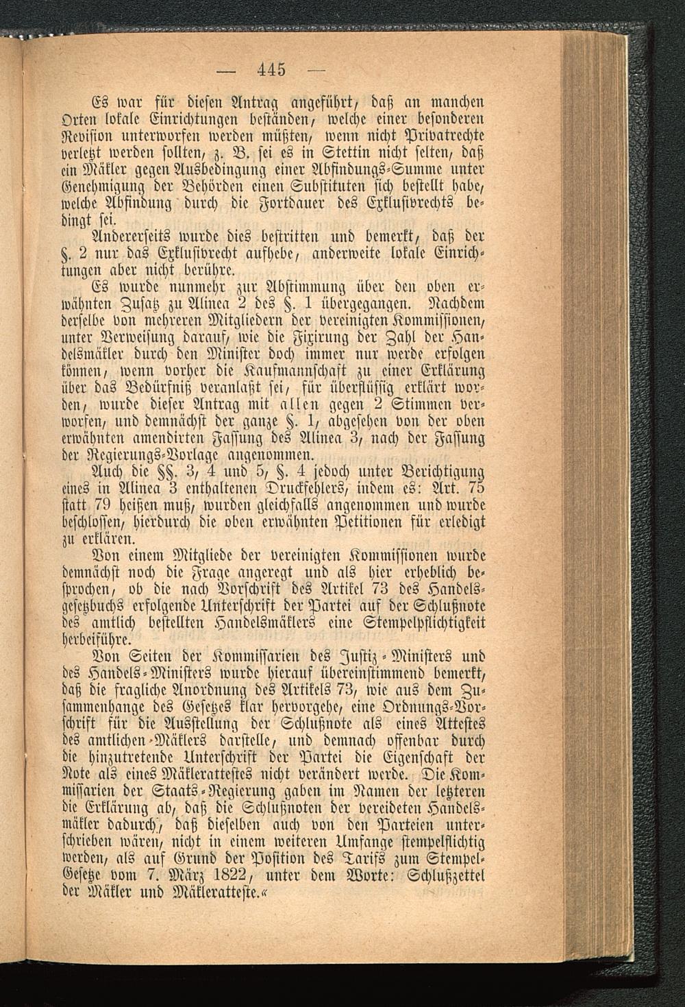 Von Seiten der Kommissarien des Justiz - Ministers unddes Handels-Ministers wnrdc hierauf übereinstimmend bemerkt,daß die fragliche Anordnung des Artikels 73, wie aus dem Zu-sammenhange des Gesetzes klar hervorgehe, eine Ordnungs-Vor-schrift für die Ausstellung der Schlußnotc als eines Attestesdes amtlichen-Mäklers darstelle, und demnach offenbar durchdie hinzutretende Unterschrift der Partei die Eigenschaft derNote als eines Mäklcrattestcs nicht verändert werde. Die Kom-missarien der Staats - Regierung gaben im Namen der letzterendie Erklärung ab, daß die Schlußnotcn der bereideten Handels-mäklcr dadurch, daß dieselben auch von den Parteien unter-schrieben wären, nicht in einem weiteren Umfange stempelflichtigwerden, als auf Grund der Position des Tarifs zum Stempel-Gesetze vom 7. März 1822, uuter dem Worte! Schlußzettclder Mäkler und Mäkleratteste.«