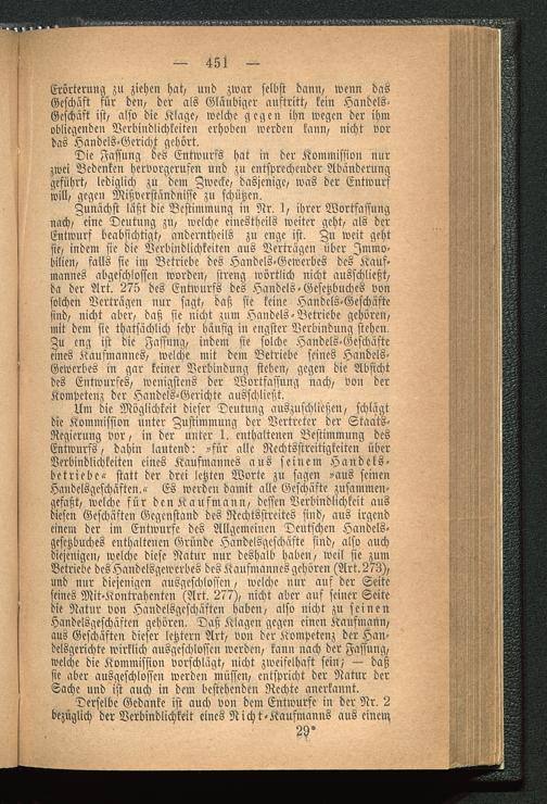 Um die Möglichkeit dieser Deutung auszuschließen, schlagtdie Kommission unter Zustimmung der Vertreter der Staats-Regicrung vor, in der unter 1. enthaltenen Bestimmung desEntwurfs, dahin lautend: »für alle Rechtsstrcitigkeitcn überVerbindlichkeiten eines Kaufmannes aus seinem Handels-betriebe« statt der drei letzten Worte zu sagen »aus seinenHandelsgeschäften.« Es werden damit alle Geschäfte zusammen-gefaßt, welche für den Kaufmann, dessen Verbindlichkeit ausdiesen Geschäften Gegenstand des Rechtsstreites sind, aus irgendeinem der im Entwürfe des Allgemeinen Deutschen Handels-gesetzbuches enthaltenen Gründe Handelsgeschäfte sind, also auchdiejenigen, welche diese Natur nur deshalb haben, weil sie zumBetriebe dcsHaudelsgewcrbes des Kaufmannes gehören (Art.273),und nur diejenigen ausgeschlossen, welche nur auf der Seiteseines Mit-Kontrahcntcn (Art. 277), nicht aber auf seiner Seitedie Natur vou Handelsgeschäften haben, also nicht zu seinenHandelsgeschäften gehören. Daß Klagen gegen einen Kaufmann,aus Geschäften dieser letzten? Art, von der Kompetenz der Han-delsgerichte wirklich ausgeschlossen werden, kann nach der Fassung,welche die Kommission vorschlägt, nicht zweifelhaft sein,' — daßsie aber ausgeschlossen werden müssen, entspricht der Natur derSache und ist auch in dem bestehenden Rechte anerkannt.