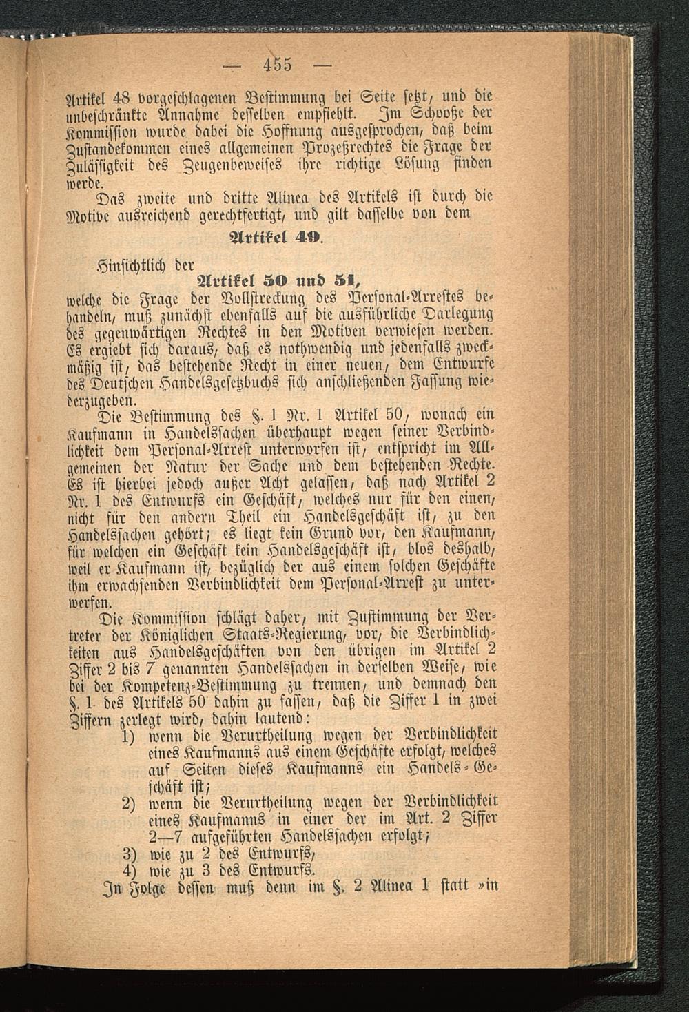 Die Bestimmung des §. 1 Nr. I Artikel 50, wonach einKaufmann in Handelssachen überhaupt wegen seiner Verbind-lichkeit dem Personal-Arrest unterworfen ist, entspricht im All-gemeinen der Natur der Sache und dem bestehenden Rechte.Es ist hierbei jedoch außer Acht gelassen, daß nach Artikel 2Nr. I des Entwurfs ein Geschäft, welches nur für den einen,nicht für den andern Theil ein Handelsgeschäft ist, zu denHandelssachen gehört/ es liegt kein Grund vor, den Kaufmann,für welchen ein Geschäft kein Handelsgeschäft ist, blos deshalb,weil er Kaufmann ist, bezüglich der aus einem solchen Geschäfteihm erwachsenden Verbindlichkeit dem Personal-Arrest zu unter-werfen.