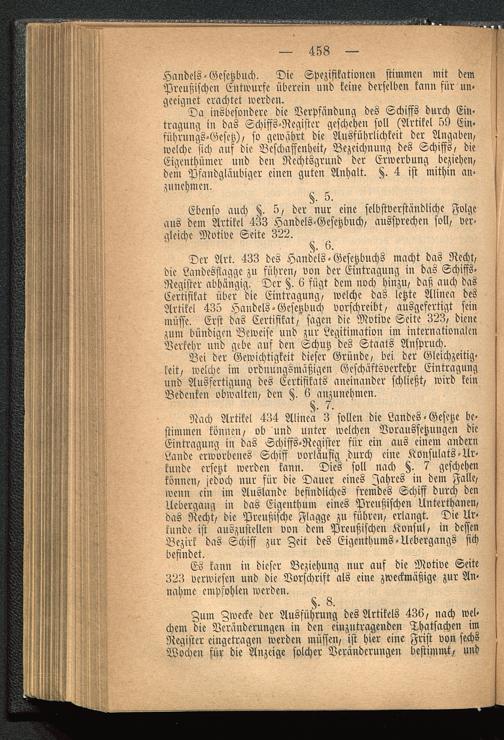 Nach Artikel 434 Alinea 3 sollen die Landes-Gesetze be-stimmen können, ob und unter welchen Voraussetzungen dieEintragung in das Schiffs-Register für ein aus einem andernLande erworbenes Schiff vorläufig durch eine Konsulats-Ur-kunde ersetzt werden kann. Dies soll nach §. 7 geschehenkönnen, jedoch nur für die Dauer eines Jahres in dem Falle,wenn ein im Auslande befindliches fremdes Schiff durch denUcbergang in das Eigenthum eines Preußischen Unterthanen,das Recht, die Preußische Flagge zu führen, erlangt. Die Ur-kunde ist auszustellen von dem Preußischen Konsul, in dessenBezirk das Schiff zur Zeit des Eigenthums-Uebergangs sichbefindet.