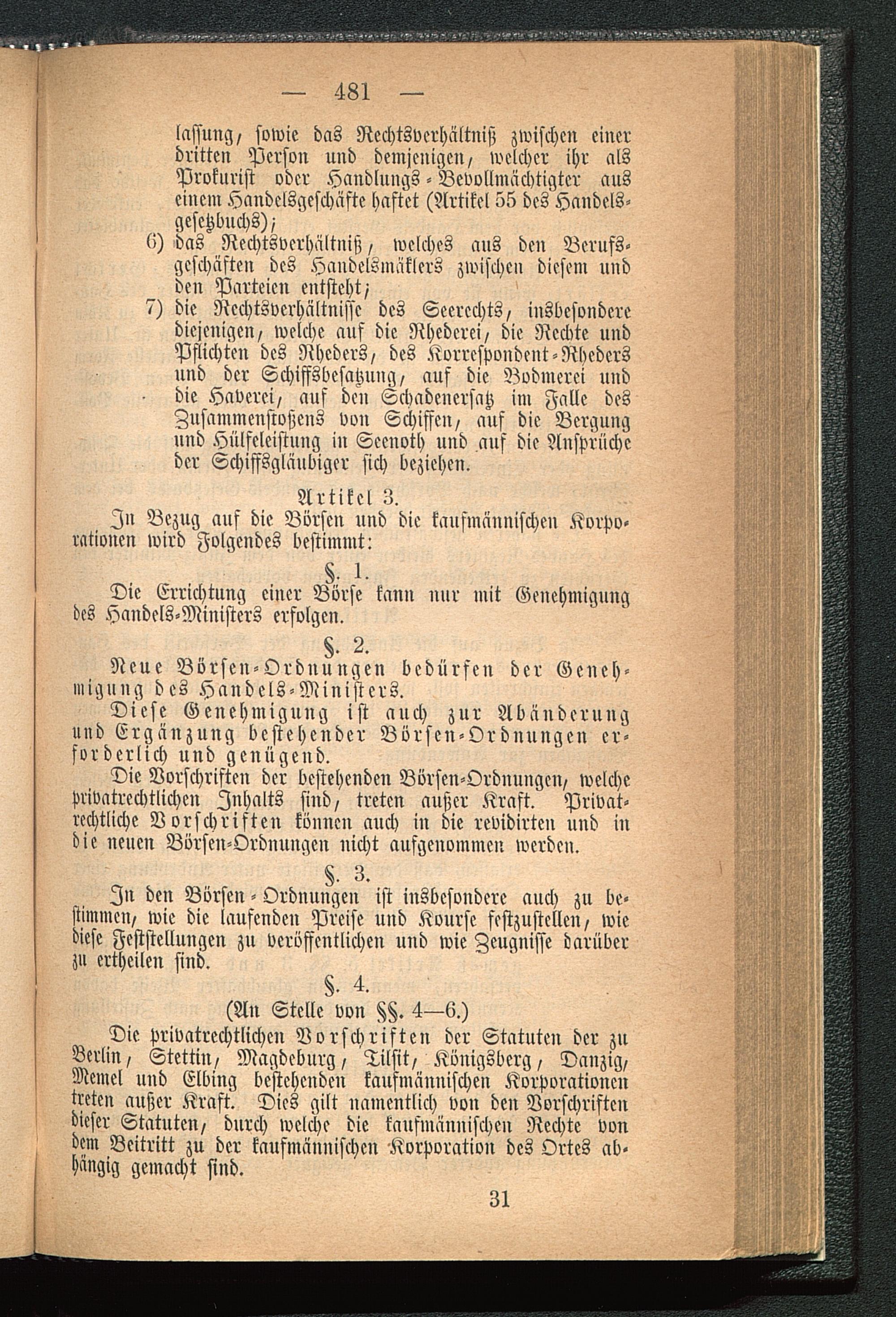 Die privatrechtlichcn Vorschriften der Statuten der zuBerlin, Stettin, Magdeburg, Tilsit, Königsberg, Danzig ,Memel und Elbing bestehenden kaufmännischen Korporationentreten außer Kraft. Dies gilt namentlich von den Vorschriftendieser Statuten, durch welche die kaufmännischen Rechte vondem Beitritt zu der kaufmännischen Korporation des Ortes ab-gemacht sind.