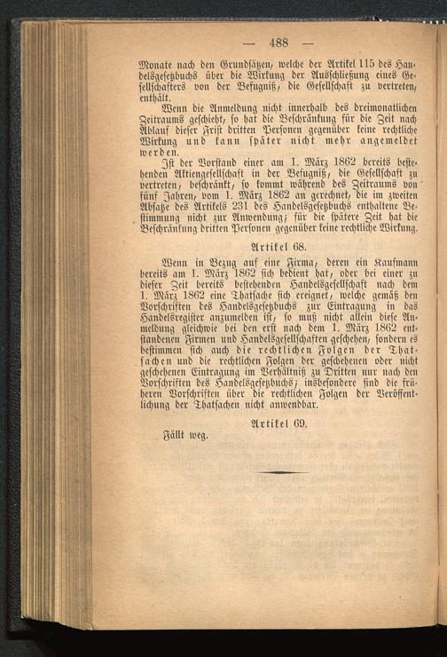 Wenn in Bezug auf eine Firma, deren ein Kaufmannbereits am 1. März 1862 sich bedient hat, oder bei einer zudieser Zeit bereits bestehenden Handelsgesellschaft nach dem1. März 1862 eine Thatsache sich ereignet, welche gemäß denVorschriften des Handelsgesetzbuchs zur Eintragung in dasHandelsregister anzumelden ist, so muß nicht allein diese An-meldung gleichwie bei den erst nach dem 1. März 1862 ent-standenen Firmen und Handelsgesellschaften geschehen, sondern esbestimmen sich auch die rechtlichen Folgen der That-sachen und die rechtlichen Folgen der geschehenen oder nichtgeschehenen Eintragung im Verhältniß zu Dritten nur nach denVorschriften des Handelsgesetzbuchs,' insbesondere sind die frü-heren Vorschriften über die rechtlichen Folgen der Veröffent-lichung der Thatsachen nicht anwendbar.