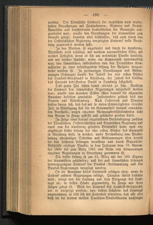 In Folge einer darauf eingetretenen Verständigung zwischender Preußischen, Oesterreichischcn und Bayerischen Negierung undeines von der Konferenz gefaßten Beschlusses hatte noch eineabgekürzte dritte Lesung der vier ersten Bücher des Entwurfsin Nürnberg statt, in welcher, unter Vermeidung von Wieder-holung abermaliger Debatten und Abstimmungen über bereitsbei den früheren Lesungen berathene und durch Majoritäts-Bcschlüsse erledigte Punkte, in dem Zeitraum vom 19. Novem-ber 1869 bis zum März 1861 eine Reihe von Erinnerungeneinzelner Regierungen in Berathung genommen ist.