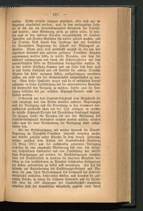 Oesterreich hat das Handels-Gesctzbuch dem Reichsrath be-reits vorgelegt, und von Seiten mancher anderen Regierungenwird die Vorlegung und die Berathung in den Kammern vor-aussichtlich gleichfalls schon vor der Zeit erfolgen, in welcherdie nächste Sitzungs-Periode des Preußischen Landtages beginnt.Die Folgen, welche für Preußen als mit der Ablehnung desVandcls-Gesetzbuchs verbunden erachtet werden müssen, würdendaher auch bei einer Verschiebung der Vorlegung nicht ausge-blieben sein.