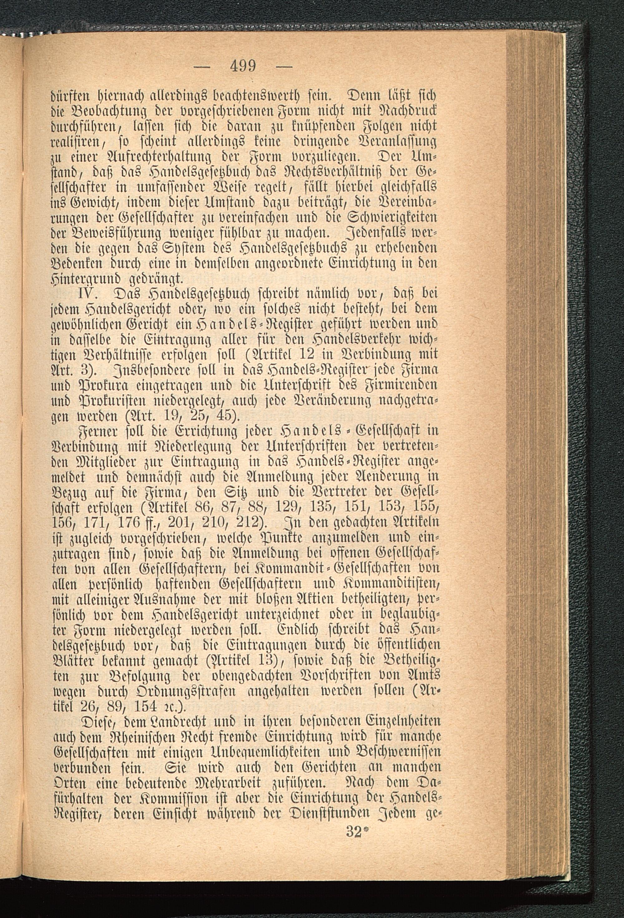 Ferner soll die Errichtung jeder Handels - Gesellschaft inVerbindung mit Niederlcgung der Unterschriften der vertreten-den Mitglieder zur Eintragung in das Handels-Register ange-meldet und demnächst auch die Anmeldung jeder Aenderung inBezug auf die Firma/ den Sitz und die Vertreter der Gesell-schaft erfolgen (Artikel 86, 87, 88, 129, 135, 151, 153, 155,156, 171, 176 ff., 201, 210, 212). In den gedachten Artikelnist zugleich vorgeschrieben, welche Punkte anzumelden und ein-zutragen sind, sowie daß die Anmeldung bei offenen Gesellschaf-ten von allen Gesellschaftern, bei Kommandit- Gesellschaften vonallen persönlich haftenden Gesellschaftern und Kommanditisten,mit alleiniger Ausnahme der mit bloßen Aktien bctheiligten, per-sönlich vor dem Handelsgericht unterzeichnet oder in beglaubig-ter Form niedergelegt werden soll. Endlich schreibt das Han-delsgesetzbuch vor, daß die Eintragungen durch die öffentlichenBlätter bekannt gemacht (Artikel 13), sowie daß die Bethcilig-tcn zur Befolgung der vbcngedachtcn Vorschriften von Amtswegen durch Ordnungsstrafen angehalten werden sollen (Ar-tikel 26, 89, 154 w.).