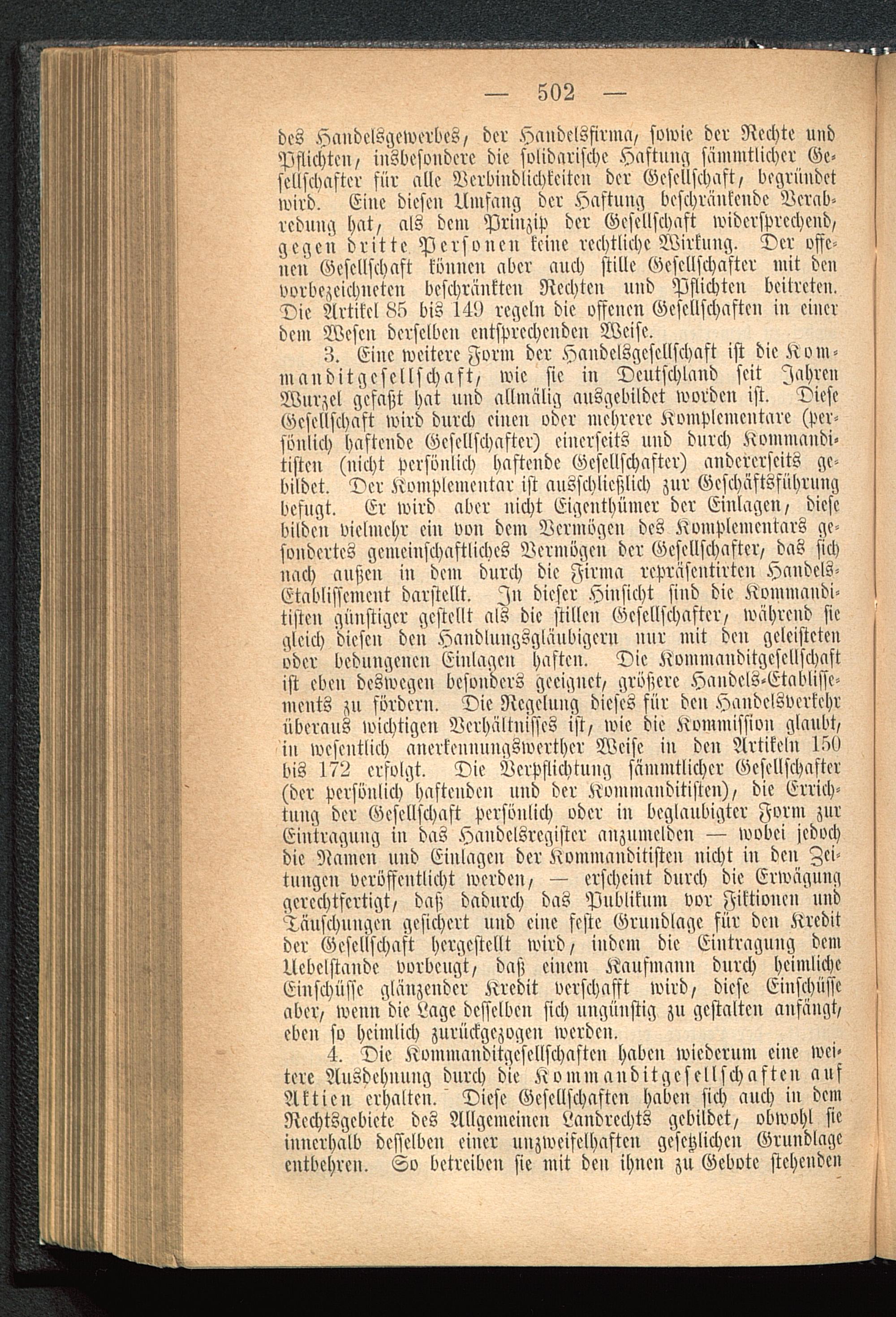des .Handelsgewerbes, der Handelsfirma, sowie der Rechte undPflichte», insbesondere die solidarische Haftung sämmtlicher Ge-sellschafter für alle Verbindlichkeiten der Gesellschaft, begründetwirdi Eine diesen Umfang der Haftung beschränkende Verab-rcdnng hat, als dem Prinzip der Gesellschaft widersprechend,gegen dritte Personen keine rechtliche Wirkung. Der offe-nen Gesellschaft können aber auch stille Gesellschafter mit denvorbezeichnctcn beschränkten Rechten und Pflichten beilreten.Die Artikel 85 bis 140 regeln die offenen Gesellschaften in einerdem Wesen derselben entsprechenden Weise.
