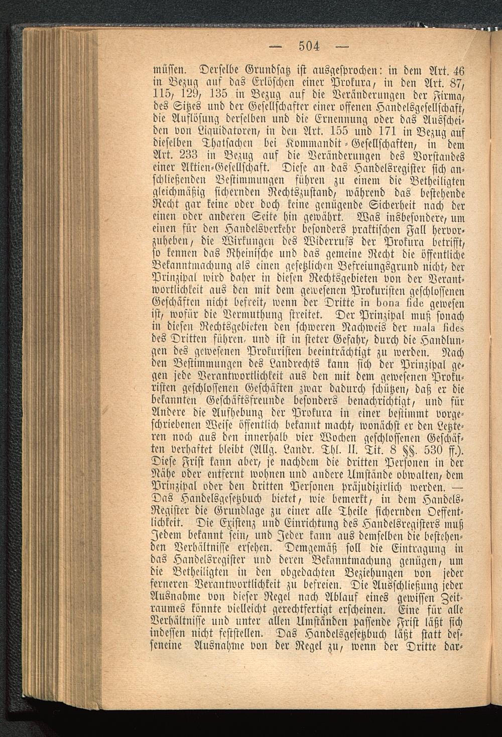 müssen. Derselbe Grundsatz ist ausgesprochen: in dem Art, 46in Bezug auf das Erloschen einer Prokura, in den Art. 87,115, 129, 135 in Bezug auf die Veränderungen der Firma,des Sitzes und der Gesellschafter einer offenen Handelsgesellschaft,die Auflösung derselben und die Ernennung oder das Ausschei-den von Liquidatoren, in den Art. 155 und 171 in Bezug aufdieselben Thatsachen bei .ssviumandit - Gesellschaften, in demArt. 233 in Bezug auf die Veränderungen des Vorstandeseiner Aktien-Gesellschaft. Diese an das Handelsregister sich an-schließenden Bestimmungen führen zu einem die Beteiligtengleichmäßig sichernden Nechtszustand, während das bestehendeRecht gar keine oder doch keine genügende Sicherheit nach dereinen oder anderen Seite hin gewährt. Was insbesondere, umeinen für den Handelsverkehr besonders praktischen Fall hervor-zuheben, die Wirkungen des Widerrufs der Prokura betrifft,so kennen das Rheinische und das gemeine Recht die öffentlicheBekanntmachung als einen gesetzlichen Bcfrciungsgrund nicht, derPrinzipal wird daher in diesen Rcchtsgcbietcn von der Verant-wortlichkeit aus den mit dem gewesenen Prokuristen geschlossenenGeschäften nicht befreit, wenn der Dritte in boim llllo gewesenist, wofür die Vermuthung streitet. Der Prinzipal muß sonachin diesen Rechtsgcbieten den schweren Nachweis der nmla lillezdes Dritten führen, und ist in steter Gefahr, durch die Handlun-gen des gewesenen Prokuristen beeinträchtigt zu werden. Nachden Bestimmungen des Landrcchts kann sich der Prinzipal ge-gen jede Verantwortlichkeit aus den mit dem gewesenen Proku-risten geschlossenen Geschäften zwar dadurch schütze», daß er diebekannten Geschäftsfreunde besonders benachrichtigt, und fürAndere die Aufhebung der Prokura in einer bestimmt vorge-schriebenen Weise öffentlich bekannt macht, wonächst er den Letzte-ren noch aus den innerhalb vier Wochen gcschlojjenen Geschäf-ten verhaltet bleibt (Allg. Landr, Thl. II, Tit , 8 K 530 ff.).Diese Frist kann aber, je nachdem die dritten Personen in derNähe oder entfernt wohnen und andere Umstände obwalten, demPrinzipal oder den dritten Personen präjudizirlich werden, —Das Handelsgesetzbuch bietet, wie bemerkt, in dem Haudels-Registcr die Grundlage zu einer alle Theile sichernden Oessent-lickkeit. Die Existenz und Einrichtung des Handelsregisters mußJedem bekannt sein, und Feder kann aus demselben die bestehen-den Verhältnisse ersehen. Demgemäß soll die Eintragung indas Handelsregister und deren Bekanntmachung genügen, umdie Betheiligten in den abgedachten Beziehungen von jederferneren Verantwortlichkeit zu befreien. Die Ausschließung jederAusnahme von dieser Regel nach Ablauf eines gewissen Zeit-raumes könnte vielleicht gerechtfertigt erscheinen. Eine für alleVerhältnisse und unter allen Umständen passende Frist läßt sichindessen nicht feststellen. Das Handelsgesetzbuch läßt statt des-scneiue Ausnahme von der Regel zu, wenn der Dritte dar-