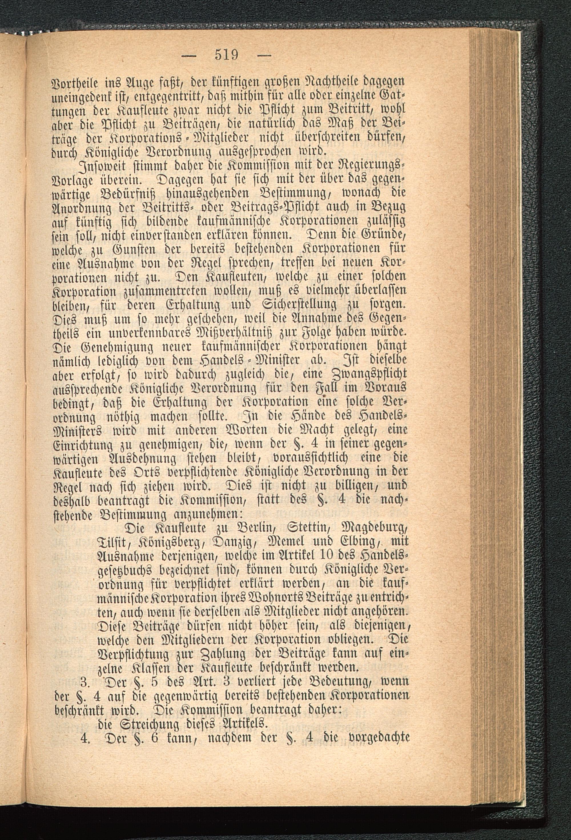 Insoweit stimmt daher die Kommission mit der Regierungs-Vorlage üöcrcin. Dagegen hat sie sich mit der über das gegen-wärtige Bedürfniß hinausgehenden Bestimmung, wonach dieAnordnung der Beitritts- oder Bcitrags-Pflicht auch in Bezugauf künftig sich bildende kaufmännische Korporationen zulässigsein soll, nicht einverstanden erklären können. Denn die Gründe,welche zu Gunsten der bereits bestehenden Korporationen füreine Ausnahme von der Regel sprechen, treffen bei neuen Kor-porationen nicht zu. Den Kaufleuten, welche zu einer solchenKorporation zusammentreten wollen, muß es vielmehr überlassenbleiben, für deren Erhaltung und Sichcrstellung zu sorgen.Dies muß um so mehr geschehen, weil die Annahme des Gegen-theils ein unverkennbares Mißverhältniß zur Folge haben würde.Die Genehmigung neuer kaufmännischer Korporationen hängtnämlich lediglich von dem Handels - Minister ab. Ist dieselbeaber erfolgch so wird dadurch zugleich die, eine Zwangspflichtaussprechende Königliche Verordnung für den Fall im Vorausbedingt, daß die Erhaltung der Korporation eine solche Ver-ordnung nöthig machen sollte. In die Hände des Handels-Ministcrs wird mit anderen Worten die Macht gelegt, eineEinrichtung zu genehmigen, die, wenn der §. 4 in seiner gegen-wärtigen Ausdehnung stehen bleibt, voraussichtlich eine dieKaufleute des Orts verpflichtende Königliche Verordnung in derRegel nach sich ziehen wird. Dies ist nicht zu billigen, unddeshalb beantragt die Kommission, statt des §. 4 die nach-stehende Bestimmung anzunehmen: