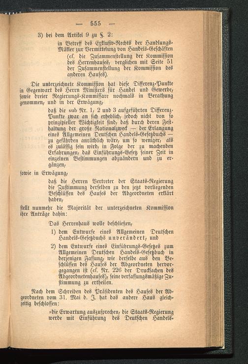 daß die sub Nr. 1, 2 und 3 aufgeführten Differenz-Punkte zwar an sich erheblich, jedoch nicht von soprinzipieller Wichtigkeit sind, daß durch deren Fest-haltung der große Nationalzweck — der Erlangungeines Allgemeinen Deutschen Handels-Gesetzbuchs —zu gefährden anräthlich wäre, um so weniger, alses zulässig sein wird, in Folge der zu machendenErsahrungen, das Einführungs-Gesetz seiner Zeit ineinzelnen Bestimmungen abzuändern und zu er-gänzen,
