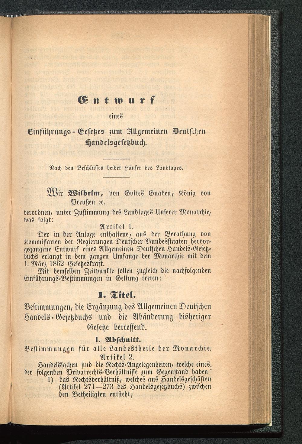 Der in der Anlage enthaltene/ aus der Berathung vonKonimissarien der Regierungen Deutscher Bundesstaaten hervor-gcgangene Entwurf eines Allgemeinen Deutschen Haudels-Gesetz-buchs erlangt in dem ganzen Umfange der Monarchie mit demI. März 1862 Gesetzeskraft.