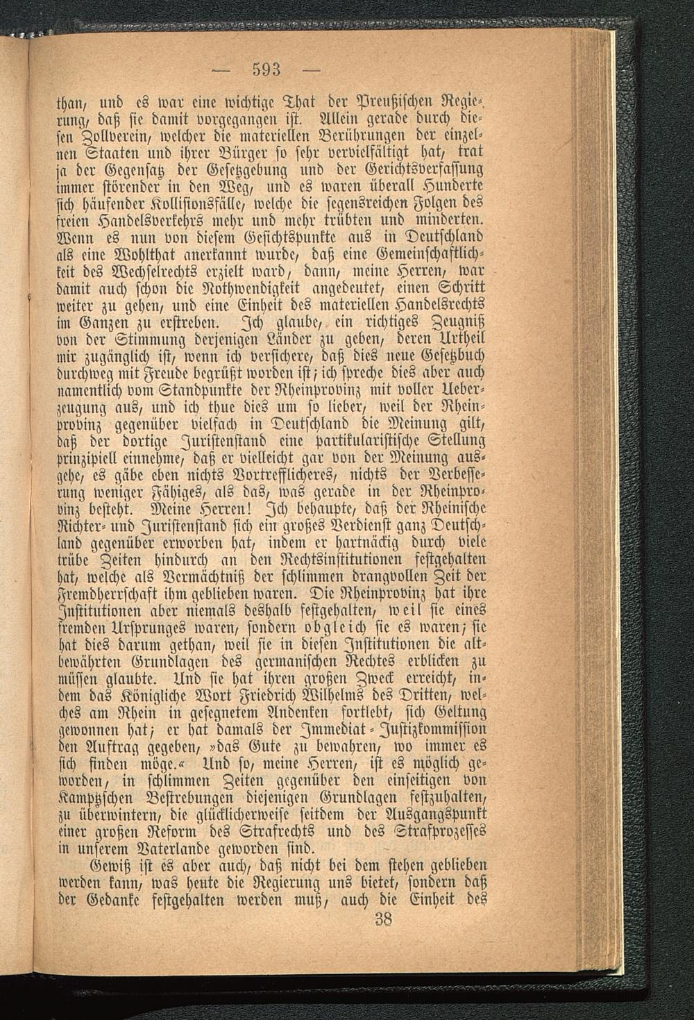 thau, und cs war eine wichtige That der Preußischen Regie-,rung, daß sie damit vorgegangen ist. Allein gerade durch die-sen Zollverein/ welcher die materiellen Berührungen der einzel-nen Staaten und ihrer Bürger so sehr vervielfältigt hat/ tratja der Gegensatz der Gesetzgebung und der Gerichtsverfassungimmer störender in den Weg/ und es waren überall Hundertesich häufender Kollisionsfällc, welche die segensreichen Folgen desfreien Handelsverkehrs mehr und mehr trübten und minderten.Wenn es nun von diesem Gesichtspunkte aus iu Deutschland als eine Wohlthat anerkannt wurde/ daß ciuc Gemeinschastlich-kcit des Wcchselrechts erzielt ward, dann, meine Herren, wardamit auch schon die Nothwendigkeit angedeutet, einen Schrittweiter zu gehen, und eine Einheit des materiellen Handelsrechtsim Ganzen zu erstreben. Ich glaube, ein richtiges Zeugnißvon der Stimmung derjenigen Länder zu geben, deren Urtheilmir zugänglich ist, wenn ich versichere, daß dies neue Gesetzbuchdurchweg mit Freude begrüßt worden ist / ich spreche dies aber auchnamentlich vom Standpunkte der Rheinproviuz mit voller Ueber-zeugung aus, und ich thue dies um so lieber, weil der Rhcin-provinz gegenüber vielfach in Deutschland die Meinung gilt,daß der dortige Iuristcnstand eine Partikularistische Stellungprinzipiell einnehme, daß er vielleicht gar von der Meinung aus-gehe, es gäbe eben nichts Vortrefflicheres, nichts der Verbesse-rung weniger Fähiges, als das, was gerade in der Rheinpro-vinz besteht. Meine Herren! Ich behaupte, daß der RheinischeRichter- und Iuristenstand sich ein großes Verdienst ganz Deutsch-land gegenüber erworben hat, indem er hartnäckig durch vieletrübe Zeiten hindurch an den Rechtsinstitutionen festgehaltenhat, welche als Vermächtnis; der schlimmen drangvollen Zeit derFremdherrschaft ihm geblieben waren. Die Rheinprovinz hat ihreInstitutionen aber niemals deshalb festgehalten, weil sie einesfremden Ursprunges waren, sondern obgleich sie cs waren/siehat dies darum gethan, weil sie in diesen Institutionen die alt-bewährten Grundlagen des germanischen Rechtes erblicken zumüssen glaubte. Und sie hat Ihren großen Zweck erreicht, in-dem das Königliche Wort Friedrich Wilhelms des Dritten, wel-ches am Rhein in gesegnetem Andenken fortlebt, sich Geltunggewonnen hat/ er hat damals der Immediat - Iustizkommissionden Auftrag gegeben, »das Gute zu bewahren, wo immer essich finden möge.« Und so, meine Herren, ist es möglich ge-worden, in schlimmen Zeiten gegenüber den einseitigen vonKamptzschcn Bestrebungen diejenigen Grundlagen festzuhalten,zu überwintern, die glücklicherweise seitdem der Ausgangspunkteiner großen Reform des Strafrcchts und des Strafprozessesin unserem Vaterlande geworden sind.
