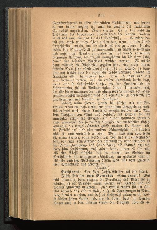 Justiz-Minister von Vernuth: Meine Herren! Wasmich veranlaßt, beim Beginn der Berathung das Wort mir zuerbitten, ist der Wunsch, einem Gefühl der Freude und desDankes Ausdruck zu geben. Dies Gefühl erklärt sich im Hin-blick darauf, daß erst im März d. F. die Berathungen in Nürn-berg beendet wurden, und daß es gleichwohl gelungen ist, heutein diesem hohen Hause, und, wie ich hoffen darf, in wenigenTagen auch in dem anderen Hause den Beschluß über die gc-