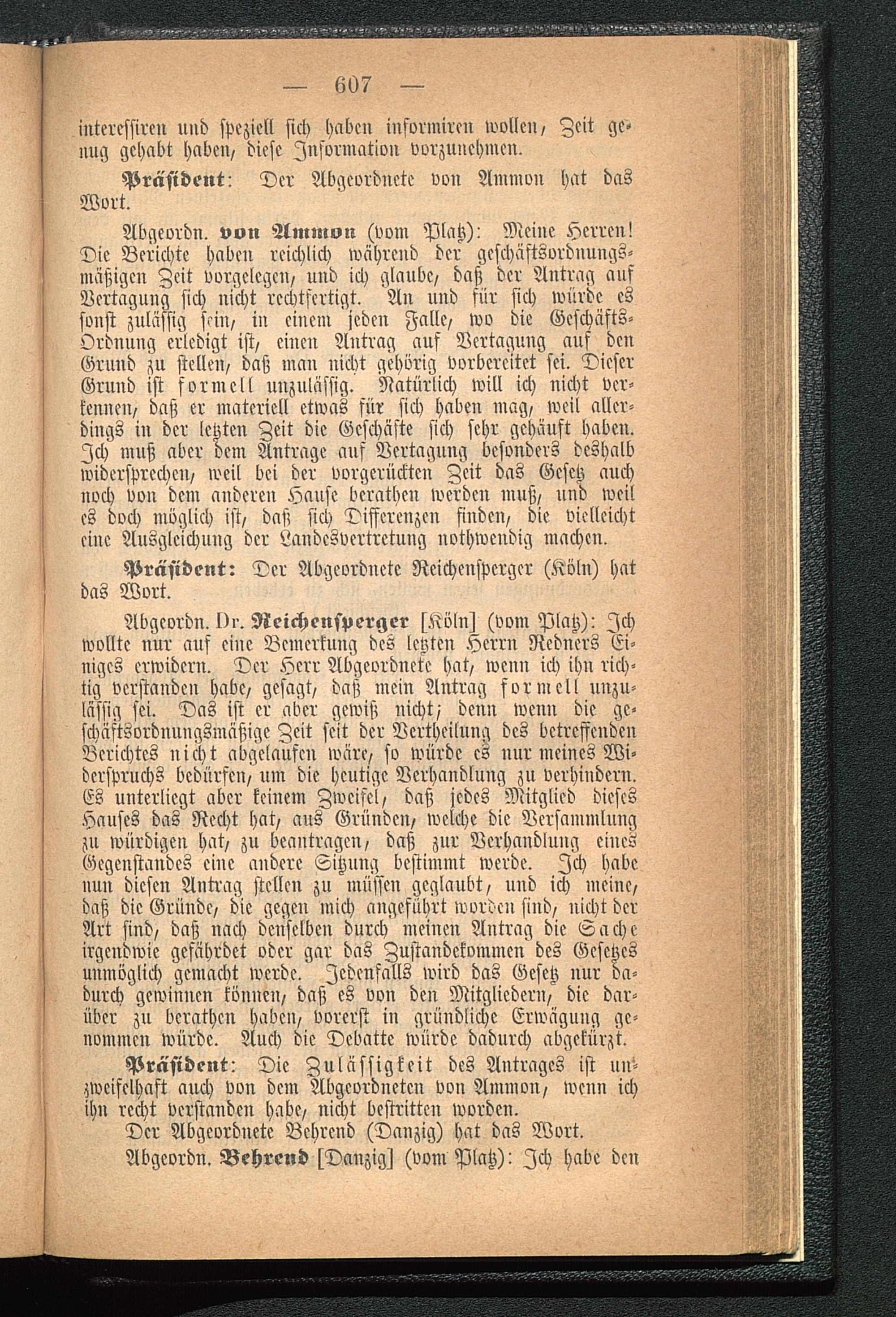 Abgeordn. I)>-. Neichcnsperger Ptölnj (vom Platz): Ichwollte nur auf eine Bemerkung des letzten Herrn Redners Ei-niges erwidern. Der Herr Abgeordnete hat, wenn ich ihn rich-tig verstanden habe, gesagt, daß mein Antrag formell unzu-lässig sei. Das ist er aber gewiß nicht/ denn wenn die gc-schäftsordnungsmäßigc Zeit seit der Vertheilung des betreffendenBerichtes nicht abgelaufen wäre, so würde es nur meines Wi-derspruchs bedürfe», um die heutige Verhandlung zu verhindern.Es unterliegt aber keinem Zweifel, daß jedes Mitglied diesesHauses das Recht hat, aus" Gründeil, welche die Versammlungzu würdigeil hat, zu beantragen, daß zur Verhandlung einesGegenstandes eine andere Sitzung bestimmt werde. Ich habenun diesen Antrag stellen zu müssen geglaubt, und ich meine,daß die Gründe, die gegen mich angeführt wurden sind, nicht derArt sind, daß nach denselben durch meinen Antrag die Sacheirgendwie gefährdet oder gar das Zustandekommen des Gesetzesunmöglich gemacht werde. Jedenfalls wird das Gesetz nur da-durch gewinnen können, daß es von den Mitgliedern/ die dar-über zu berathen haben, vorerst in gründliche Erwägung ge-nommen würde. Auch die Debatte würde dadurch abgekürzt.